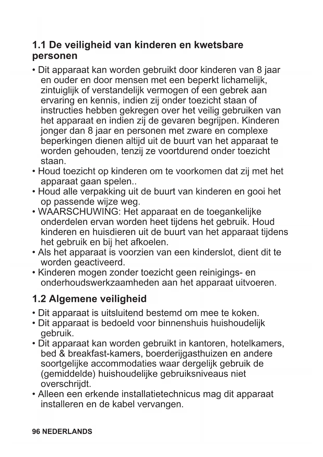 Lees zorgvuldig de meegeleverde instructies voor installatie en gebruik van het apparaat. De fabrikant is niet verantwoordelijk voor verwondingen of schade die voortvloeit uit de onjuiste installatie of het onjuiste gebruik. Bewaar de instructies altijd op een veilige, toegankelijke plek voor toekomstig gebruik. NEDERLANDS 951.1 De veiligheid van kinderen en kwetsbare personen