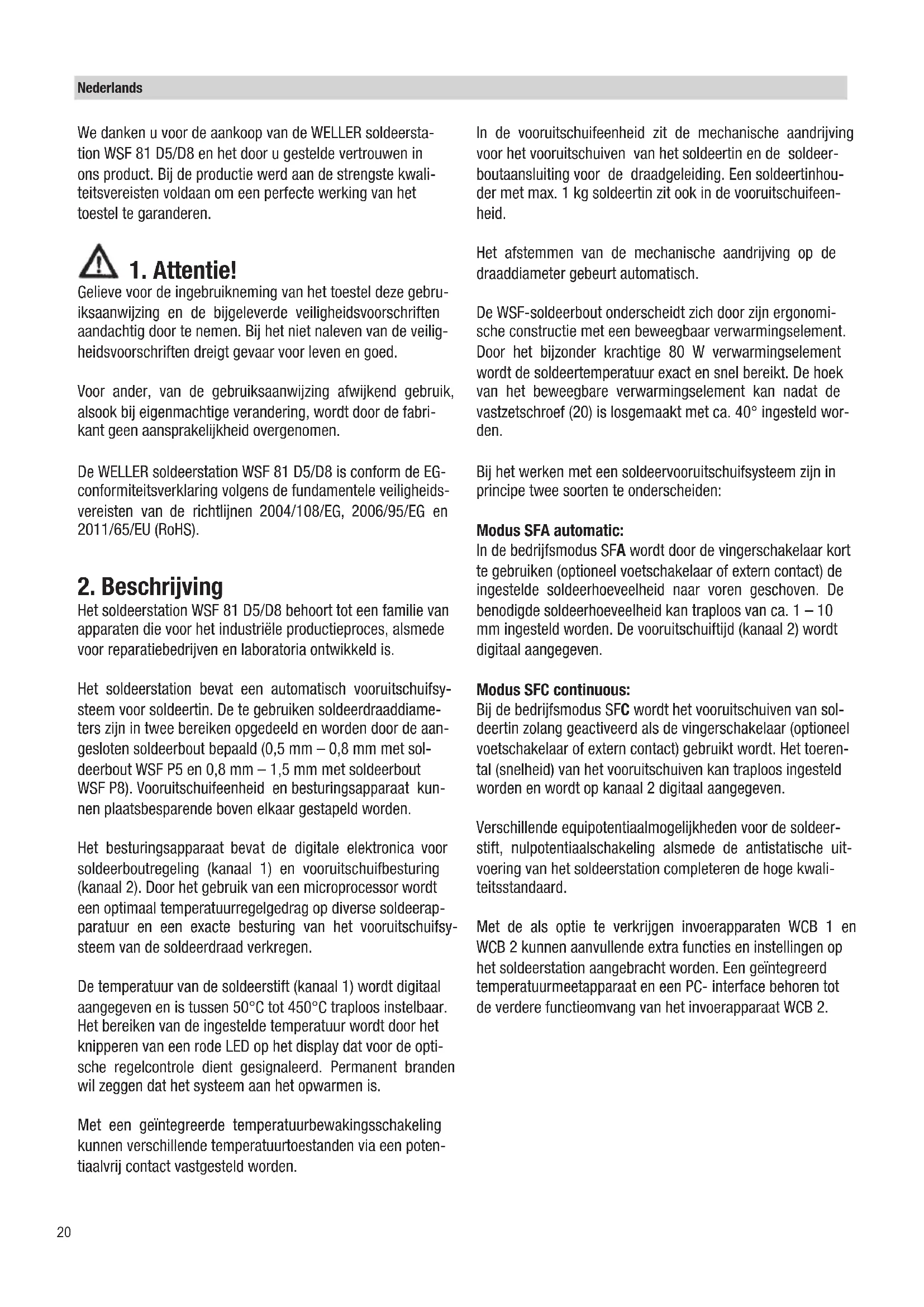 Gelieve voor de ingebruikneming van het toestel deze gebru- iksaanwijzing en de bijgeleverde veiligheidsvoorschriften aandachtig door te nemen. Bij het niet naleven van de veilig- heidsvoorschriften dreigt gevaar voor leven en goed. Voor ander, van de gebruiksaanwijzing afwijkend gebruik, alsook bij eigenmachtige verandering, wordt door de fabri- kant geen aansprakelijkheid overgenomen. De WELLER soldeerstation WSF 81 D5/D8 is conform de EG- conformiteitsverklaring volgens de fundamentele veiligheids- vereisten van de richtlijnen 2004/108/EG, 2006/95/EG en 2011/65/EU (RoHS).