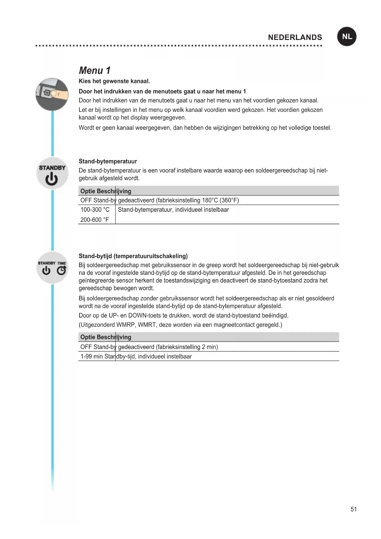 - Vericar os ajustes da interface51 Menu 1 Kies het gewenste kanaal. Door het indrukken van de menutoets gaat u naar het menu 1 Door het indrukken van de menutoets gaat u naar het menu van het voordien gekozen kanaal. Let er bij instellingen in het menu op welk kanaal voordien werd gekozen. Het voordien gekozen kanaal wordt op het display weergegeven. Wordt er geen kanaal weergegeven, dan hebben de wijzigingen betrekking op het volledige toestel. Stand-bytemperatuur De stand-bytemperatuur is een vooraf instelbare waarde waarop een soldeergereedschap bij niet- gebruik afgesteld wordt. Optie Beschrijving OFF Stand-by gedeactiveerd (fabrieksinstelling 180°C (360°F) 100-300 °C 200-600 °F Stand-bytemperatuur, individueel instelbaar Stand-bytijd (temperatuuruitschakeling) Bij soldeergereedschap met gebruikssensor in de greep wordt het soldeergereedschap bij niet-gebruik na de vooraf ingestelde stand-bytijd op de stand-bytemperatuur afgesteld. De in het gereedschap geïntegreerde sensor herkent de toestandswijziging en deactiveert de stand-bytoestand zodra het gereedschap bewogen wordt. Bij soldeergereedschap zonder gebruikssensor wordt het soldeergereedschap als er niet gesoldeerd wordt na de vooraf ingestelde stand-bytijd op de stand-bytemperatuur afgesteld. Door op de UP- en DOWN-toets te drukken, wordt de stand-bytoestand beëindigd. (Uitgezonderd WMRP, WMRT, deze worden via een magneetcontact geregeld.) Optie Beschrijving OFF Stand-by gedeactiveerd (fabrieksinstelling 2 min) 1-99 min Standby-tijd, individueel instelbaar