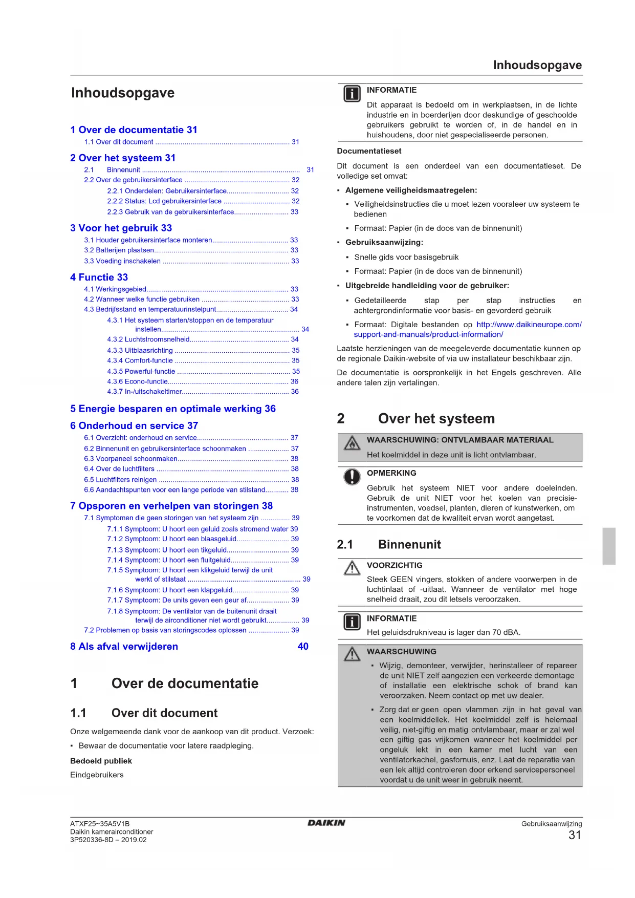 Download de handleiding voor uw Airconditioning in PDF-formaat gratis! Vind uw handleiding ATXF71A2V1B - DAIKIN en neem uw elektronisch apparaat weer in handen. Op deze pagina staan alle documenten die nodig zijn voor het gebruik van uw apparaat. ATXF71A2V1B van het merk DAIKIN.