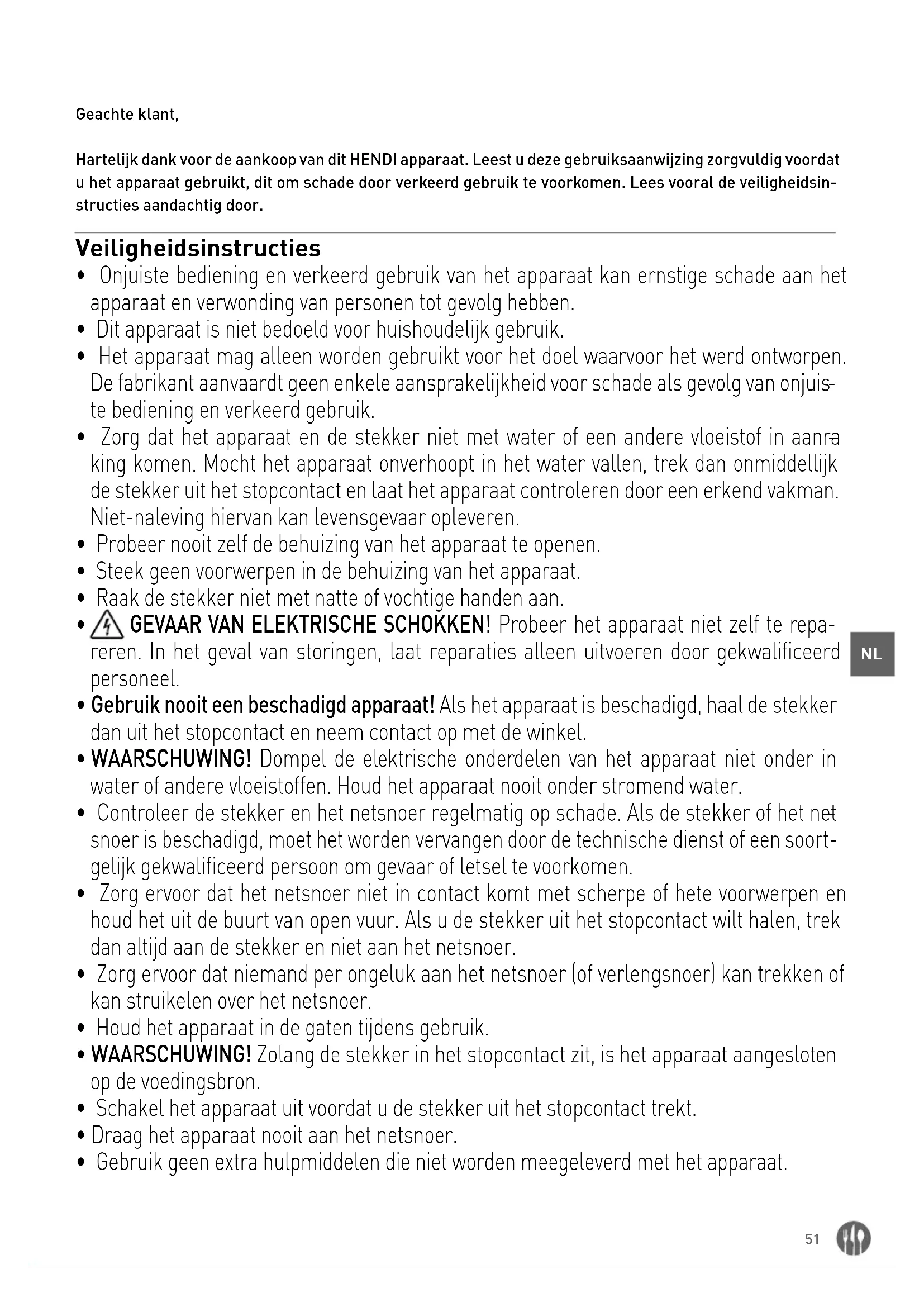 Geachte klant, Hartelijk dank voor de aankoop van dit HENDI apparaat. Leest u deze gebruiksaanwijzing zorgvuldig voordat u het apparaat gebruikt, dit om schade door verkeerd gebruik te voorkomen. Lees vooral de veiligheidsin- structies aandachtig door. Veiligheidsinstructies