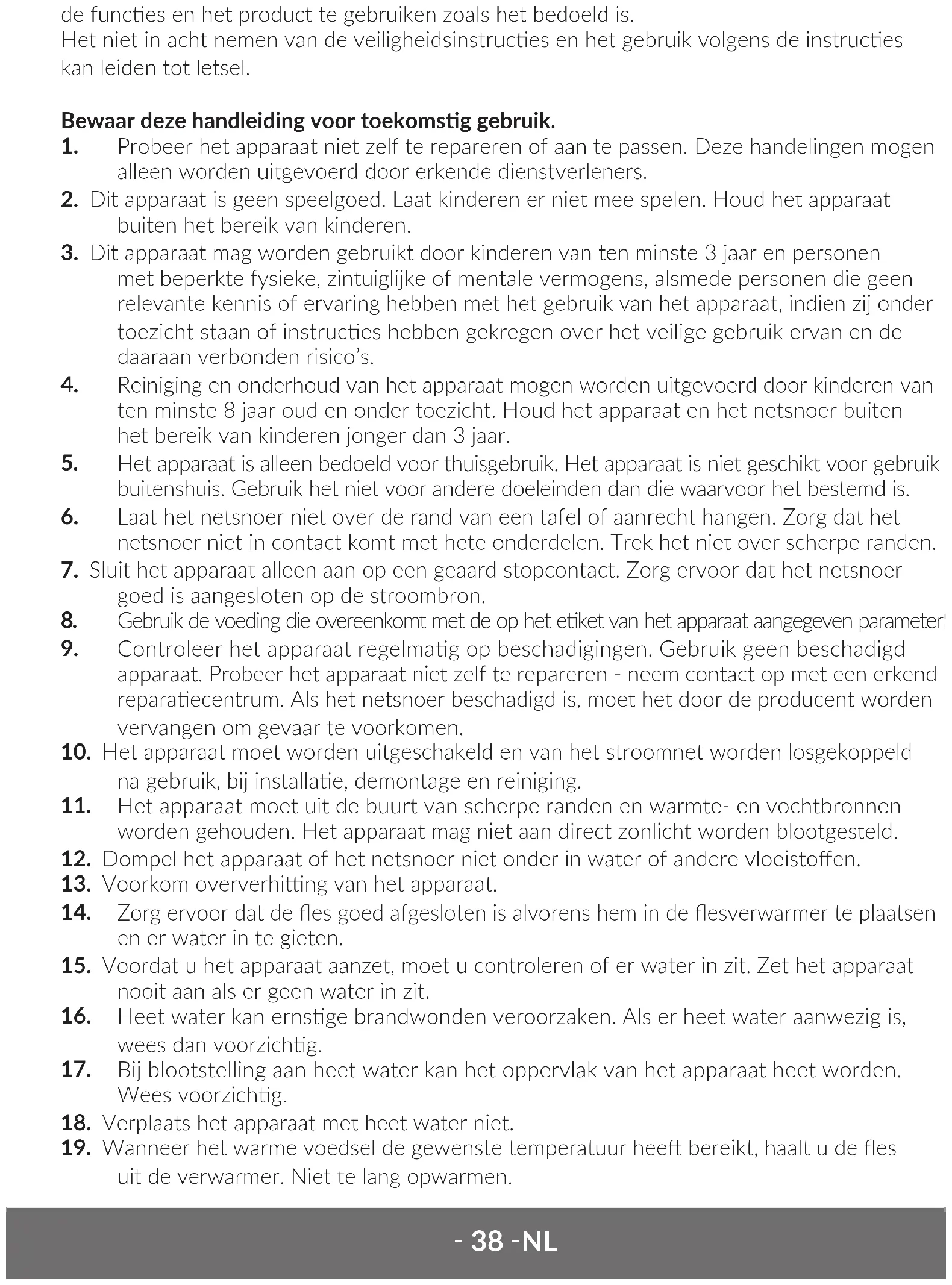 Hoeveelheid melk 60 – 120 ml 120 – 180 ml 180 – 240 ml Glazen es 4 – 6,5 min 6,5 – 7,5 min 7,5 – 9,5 min‑ 40 ‑NL Plasc es 6 – 8 min 8 – 9,5 min 9,5 – 10,5 min Siliconen es 8,5 – 11,5 min 11,5 – 15 min 15 – 17,5 min LET OP De bovenstaande cijfers gelden voor een uitgangstemperatuur van 20C voor water en 3-7C voor melk. Om een specieke temperatuur te bereiken, gebruikt u de temperatuurbehoud funce. Funce voor temperatuurbehoud