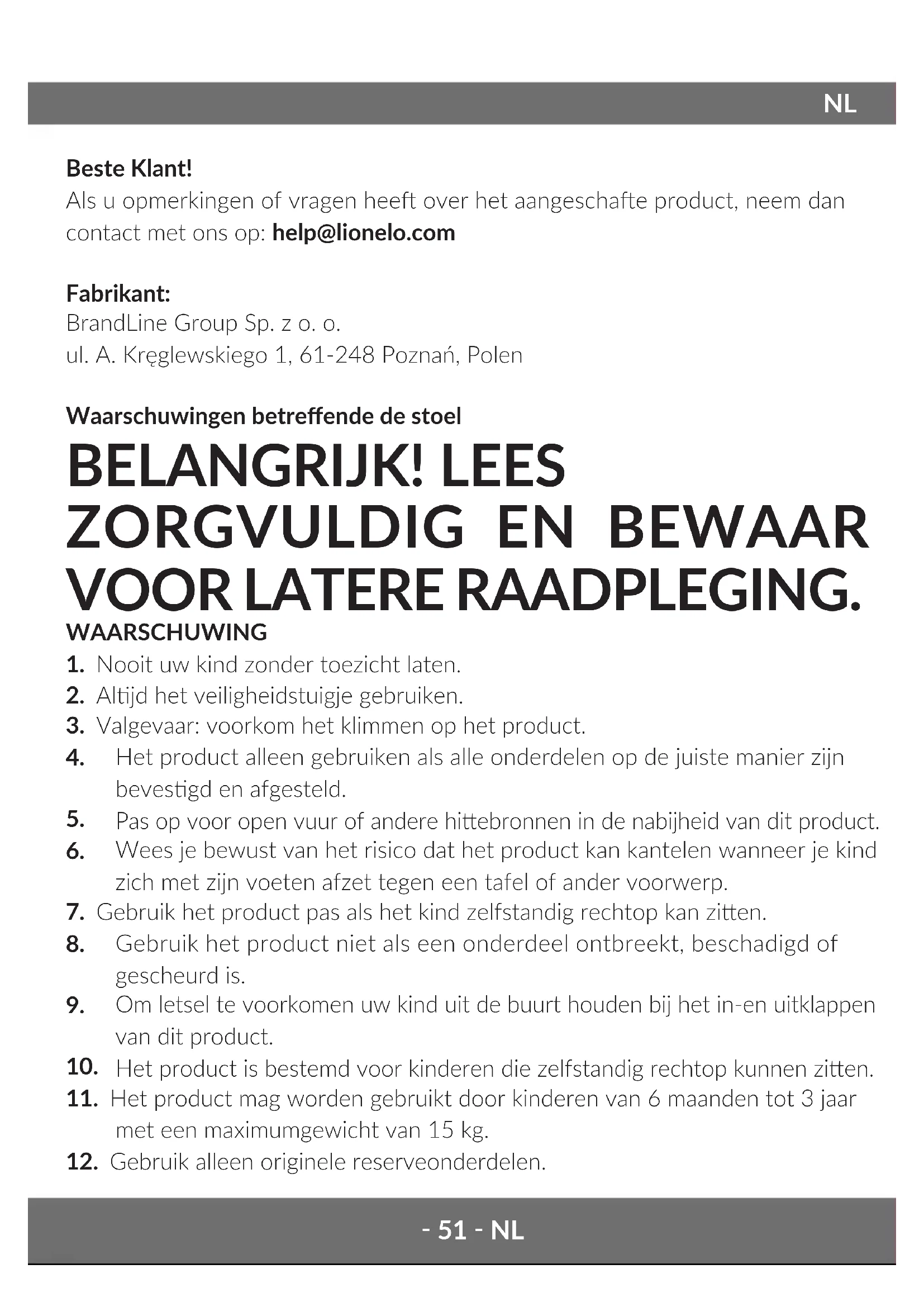 Beste Klant! Als u opmerkingen of vragen hee over het aangeschae product, neem dan contact met ons op: help@lionelo.com Fabrikant: BrandLine Group Sp. z o. o. ul. A. Kręglewskiego 1, 61-248 Poznań, Polen Waarschuwingen betreende de stoel BELANGRIJK! LEES