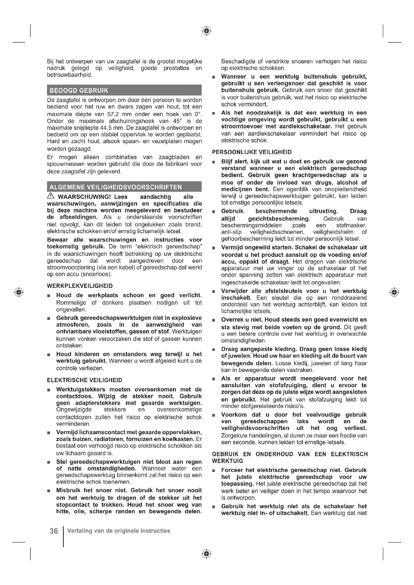ELBij het ontwerpen van uw zaagtafel is de grootst mogelijke nadruk gelegd op veiligheid, goede prestaties en betrouwbaarheid. BEOOGD GEBRUIK De zaagtafel is ontworpen om door één persoon te worden bediend voor het ruw en dwars zagen van hout, tot een maximale diepte van 57,2 mm onder een hoek van 0°. Onder de maximale afschuiningshoek van 45° is de maximale snijdiepte 44,5 mm. De zaagtafel is ontworpen en bedoeld om op een stabiel oppervlak te worden geplaatst. Hard en zacht hout, alsook spaan- en vezelplaten mogen worden gezaagd. Er mogen alleen combinaties van zaagbladen en spouwmessen worden gebruikt die door de fabrikant voor deze zaagtafel zijn geleverd. ALGEMENE VEILIGHEIDSVOORSCHRIFTEN WAARSCHUWING! Lees aandachtig alle waarschuwingen, aanwijzingen en specificaties die bij deze machine worden meegeleverd en bestudeer de afbeeldingen. Als u onderstaande voorschriften niet opvolgt, kan dit leiden tot ongelukken zoals brand, elektrische schokken en/of ernstig lichamelijk letsel. Bewaar alle waarschuwingen en instructies voor toekomstig gebruik. De term “elektrisch gereedschap” in de waarschuwingen heeft betrekking op uw elektrische gereedschap dat wordt aangedreven door een stroomvoorziening (via een kabel) of gereedschap dat werkt op een accu (snoerloos). WERKPLEKVEILIGHEID ■ Houd de werkplaats schoon en goed verlicht. Rommelige of donkere plaatsen nodigen uit tot ongevallen. ■ Gebruik gereedschapswerktuigen niet in explosieve atmosferen, zoals in de aanwezigheid van ontvlambare vloeistoffen, gassen of stof. Werktuigen kunnen vonken veroorzaken die stof of gassen kunnen ontsteken. ■ Houd kinderen en omstanders weg terwijl u het werktuig gebruikt. Wanneer u wordt afgeleid kunt u de controle verliezen. ELEKTRISCHE VEILIGHEID ■ Werktuigstekkers moeten overeenkomen met de contactdoos. Wijzig de stekker nooit. Gebruik geen adapterstekkers met geaarde werktuigen. Ongewijzigde stekkers en overeenkomstige contactdozen zullen het risico op elektrische schok verminderen. ■ Vermijd lichaamscontact met geaarde oppervlakken, zoals buizen, radiatoren, fornuizen en koelkasten. Er bestaat een verhoogd risico op elektrische schokken als uw lichaam geaard is. ■ Stel gereedschapswerktuigen niet bloot aan regen of natte omstandigheden. Wanneer water een gereedschapswerktuig binnenkomt zal het risico op een elektrische schok toenemen. ■ Misbruik het snoer niet. Gebruik het snoer nooit om het werktuig te dragen of de stekker uit het stopcontact te trekken. Houd het snoer weg van hitte, olie, scherpe randen en bewegende delen. Beschadigde of verstrikte snoeren verhogen het risico op elektrische schokken. ■ Wanneer u een werktuig buitenshuis gebruikt, gebruikt u een verlengsnoer dat geschikt is voor buitenshuis gebruik. Gebruik een snoer dat geschikt is voor buitenshuis gebruik, wat het risico op elektrische schok vermindert. ■ Als het noodzakelijk is dat een werktuig in een vochtige omgeving wordt gebruikt, gebruikt u een stroomtoevoer met aardlekschakelaar. Het gebruik van een aardlekschakelaar vermindert het risico op elektrische schok. PERSOONLIJKE VEILIGHEID ■ Blijf alert, kijk uit wat u doet en gebruik uw gezond verstand wanneer u een elektrisch gereedschap bedient. Gebruik geen krachtgereedschap als u moe of onder de invloed van drugs, alcohol of medicijnen bent. Een ogenblik van onoplettendheid terwijl u gereedschapswerktuigen gebruikt, kan leiden tot ernstige persoonlijke letsels. ■ Gebruik beschermende uitrusting. Draag altijd gezichtsbescherming. Gebruik van beschermingsmiddelen zoals een stofmasker, anti-slip veiligheidsschoenen, veiligheidshelm of gehoorbescherming leidt tot minder persoonlijk letsel. ■ Vermijd ongewild starten. Schakel de schakelaar uit voordat u het product aansluit op de voeding en/of accu, oppakt of draagt. Het dragen van elektrische apparatuur met uw vinger op de schakelaar of het onder spanning zetten van elektrisch apparatuur met ingeschakelde schakelaar leidt tot ongevallen. ■ Verwijder alle afstelsleutels voor u het werktuig inschakelt. Een sleutel die op een ronddraaiend onderdeel van het werktuig achterblijft, kan leiden tot lichamelijke letsels. ■ Overrek u niet. Houd steeds een goed evenwicht en sta stevig met beide voeten op de grond. Dit geeft u een betere controle over het werktuig in overwachte omstandigheden. ■ Draag aangepaste kleding. Draag geen losse kledij of juwelen. Houd uw haar en kleding uit de buurt van bewegende delen. Losse kledij, juwelen of lang haar kan in bewegende delen vastraken. ■ Als er apparatuur wordt meegeleverd voor het aansluiten van stofafzuiging, dient u ervoor te zorgen dat deze op de juiste wijze wordt aangesloten en gebruikt. Het gebruik van stofafzuiging leidt tot minder stofgerelateerde risico’s. ■ Voorkom dat u door het veelvoudige gebruik van gereedschappen laks wordt en de veiligheidsvoorschriften uit het oog verliest. Zorgeloze handelingen, al duren ze maar een fractie van een seconde, kunnen leiden tot ernstige letsels.