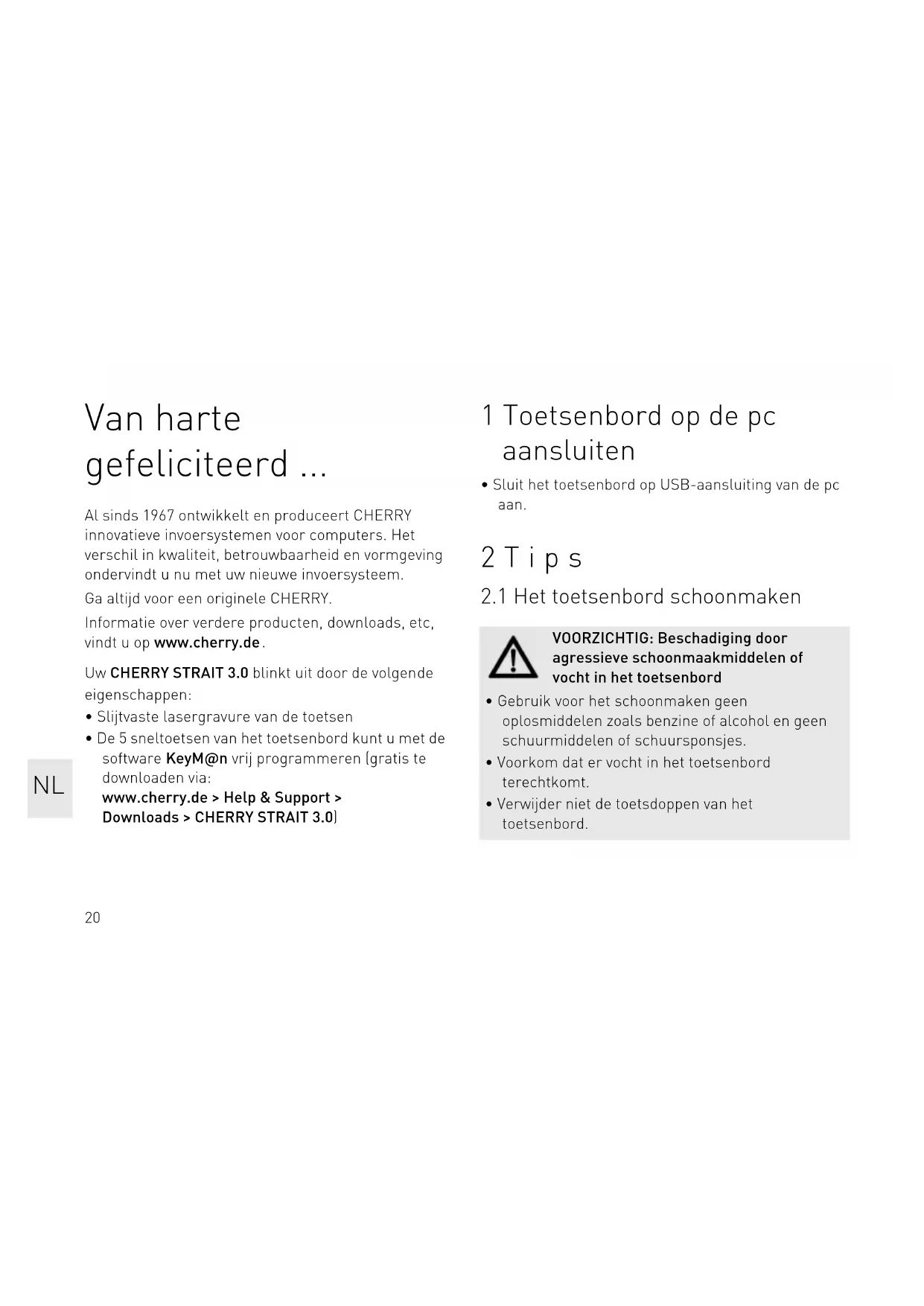 - De 5 sneltoetsen van het toetsenbord kunt u met de software KeyM@n vrij programmeren (gratis te downloaden via: www.cherry.de > Help & Support > Downloads > CHERRY STRAIT 3.0) 1 Toetsenbord op de pc aansluiten