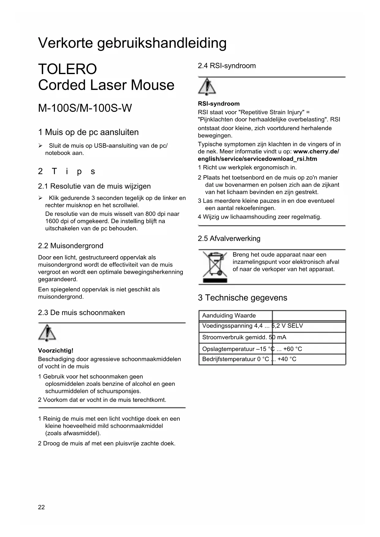 - Besturingssysteem en eventueel geinstalleerde versie van een Service Pack 5 Algemene gebruikerstip Cherry optimaliseert haar producten voortdurend in het kader van de ontwikkeling van nieuwe technolo- gieën. Daarom worden technische wijzigingen voorbe- houden. De vaststelling van de betrouwbaarheid en de definitie van technische gegevens vinden plaats overeenkomstig onderzoek dat intern bij Cherry wordt uitgevoerd zodat aan internationaal erkende voor- schriften en normen wordt voldaan. Aan eisen die daarvan afwijken kan door wederzijdse samenwer- king worden voldaan. Onjuiste behandeling, opslag en externe invloeden kunnen bij het gebruik leiden tot storingen en schade. Wij aanvaarden geen enkele aansprakelijkheid voor gebreken die op een wijziging van het product door de gebruiker berusten en zijn niet aansprakelijk in geval van onbevoegde wijzigingen. Alle reparaties moeten door Cherry of door een officieel bevoegde persoon of organisatie worden uitgevoerd. Eventuele schadeclaims tegen Cherry of haar aange- stelde vertegenwoordigers – ongeacht uit welke rechtsgrond (inclusief lichamelijke schade die het gevolg is van stress) – zijn uitgesloten, tenzij ons opzet, grove nalatigheid of niet-naleving van dwin- gende productaansprakelijkheidsbepalingen kan wor- den verweten of als er sprake is van levens-, lichaams- of gezondheidsschade. De beschikbare handleiding geldt alleen voor het meegeleverde pro- duct. Meer informatie hierover is verkrijgbaar bij de desbe- treffende Cherry-distributeurs of direct via Cherry GmbH. Klasse 1 laserprodukt EN 60825-1:2007 Veilig onder redelijkerwijs te voorziene bepalingen. Gevaar door de laser bij een defecte muis De laserstraal is onzichtbaar. Bij een defecte muis kan de straling toenemen. 1 Als u een defect vermoedt: kijk niet in de laseropening aan de onderkant van de muis. 2 Schakel de defecte muis onmiddellijk uit. 3 Laat de defecte muis bij uw verkoper repareren of breng deze naar een inzamelingspunt voor elektronisch afval of naar de verkoper van het apparaat. 4 Meer informatie vindt u op: www.cherry.de/english/service/ service_laser_class_1.htm 6 CE-verklaring van overeenstemming Wij, Cherry GmbH, verklaren, dat het product TOLERO (F100S) overeenstemt met de bepalingen van de volgende richtlijne:
