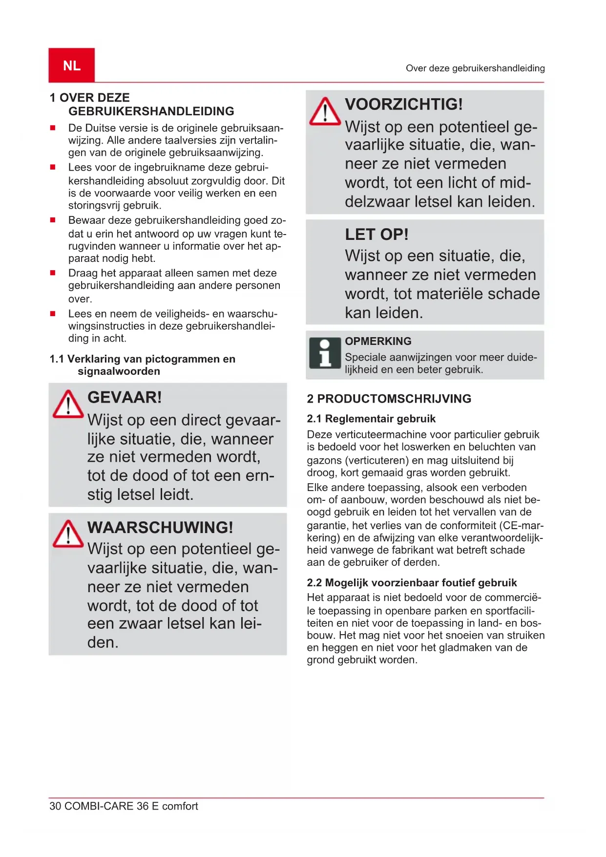 Deze verticuteermachine voor particulier gebruik is bedoeld voor het loswerken en beluchten van gazons (verticuteren) en mag uitsluitend bij droog, kort gemaaid gras worden gebruikt. Elke andere toepassing, alsook een verboden om- of aanbouw, worden beschouwd als niet be- oogd gebruik en leiden tot het vervallen van de garantie, het verlies van de conformiteit (CE-mar- kering) en de afwijzing van elke verantwoordelijk- heid vanwege de fabrikant wat betreft schade aan de gebruiker of derden.