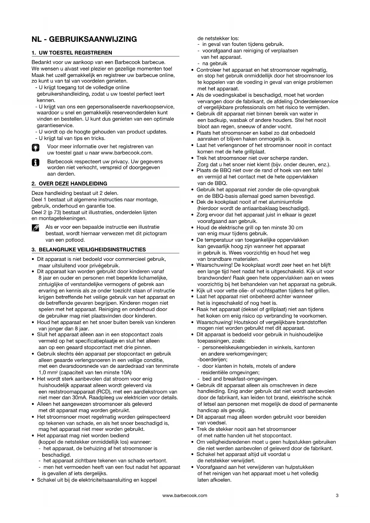Bedankt voor uw aankoop van een Barbecook barbecue. We wensen u alvast veel plezier en gezellige momenten toe! Maak het uzelf gemakkelijk en registreer uw barbecue online, zo kunt u van tal van voordelen genieten. - U krijgt toegang tot de volledige online gebruikershandleiding, zodat u uw toestel perfect leert kennen. - U krijgt van ons een gepersonaliseerde naverkoopservice, waardoor u snel en gemakkelijk reserveonderdelen kunt vinden en bestellen. U kunt dus genieten van een optimale garantieservice. - U wordt op de hoogte gehouden van product updates. - U krijgt tal van tips en tricks. Voor meer informatie over het registreren van uw toestel gaat u naar www.barbecook.com. Barbecook respecteert uw privacy. Uw gegevens worden niet verkocht, verspreid of doorgegeven aan derden.