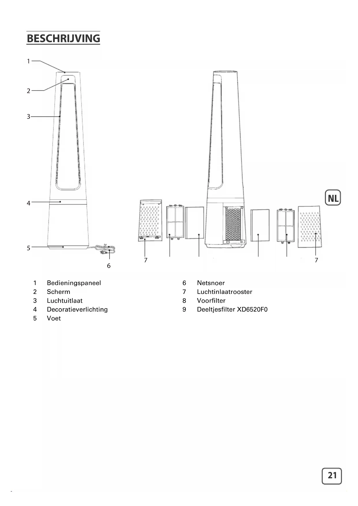 Schakel het apparaat altijd uit en haal de stekker uit het stopcontact voordat u onderhouds- of schoonmaakwerkzaamheden uitvoert. Gebruik een vochtige doek om het oppervlak van het product te reinigen. Belangrijk: Gebruik geen schuurmiddelen, omdat dit het oppervlak van het product kan beschadigen. 1 Filtermodel: XD6520F0 (inclusief 2 sets) 3 Vervangen van een lter Geforceerde reset: Als u een filter hebt vervangen voordat de levensduur ervan is verstreken, moet u de filtervervangingscyclus geforceerd opnieuw instellen: Houd de resetknop 3 seconden ingedrukt