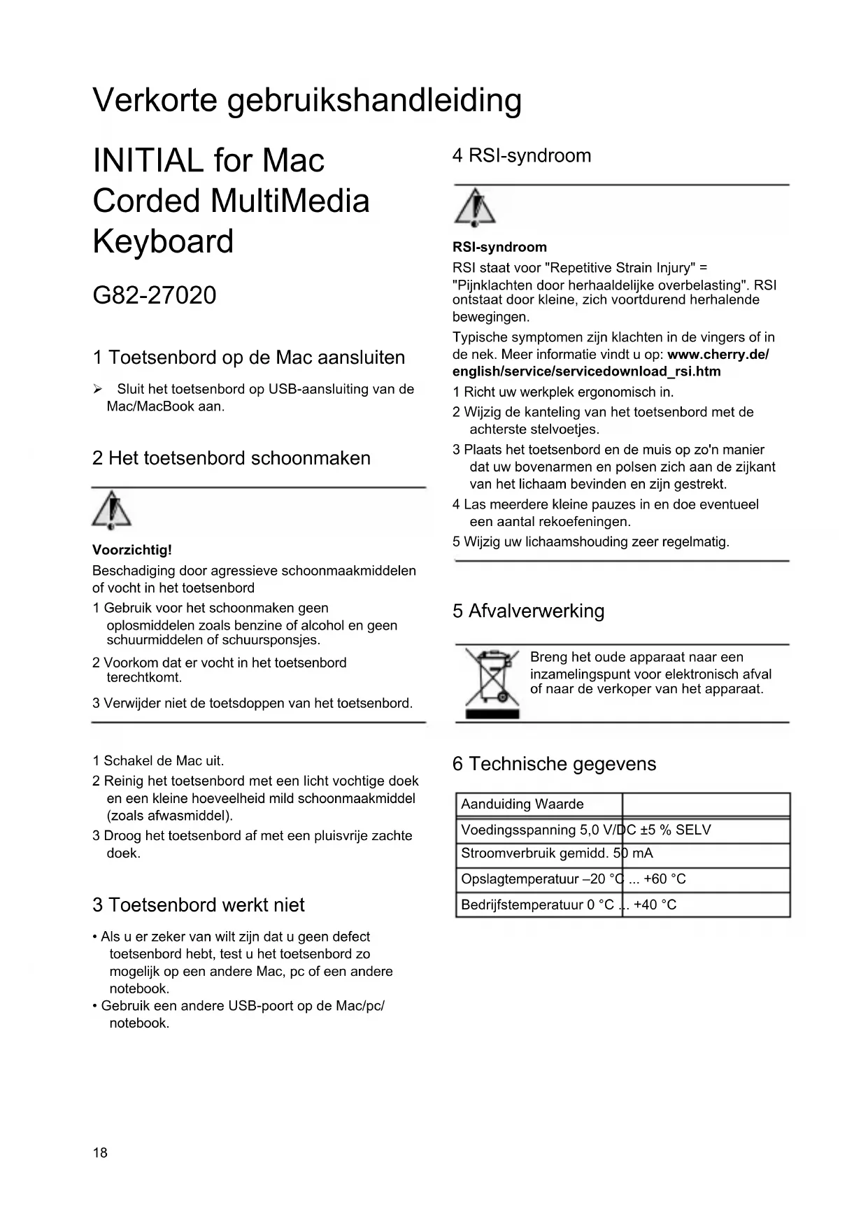 - Gebruik een andere USB-poort op de Mac/pc/ notebook. 4 RSI-syndroom RSI-syndroom RSI staat voor "Repetitive Strain Injury" = "Pijnklachten door herhaaldelijke overbelasting". RSI ontstaat door kleine, zich voortdurend herhalende bewegingen. Typische symptomen zijn klachten in de vingers of in de nek. Meer informatie vindt u op: www.cherry.de/ english/service/servicedownload_rsi.htm 1 Richt uw werkplek ergonomisch in. 2 Wijzig de kanteling van het toetsenbord met de achterste stelvoetjes. 3 Plaats het toetsenbord en de muis op zo'n manier dat uw bovenarmen en polsen zich aan de zijkant van het lichaam bevinden en zijn gestrekt. 4 Las meerdere kleine pauzes in en doe eventueel een aantal rekoefeningen. 5 Wijzig uw lichaamshouding zeer regelmatig. 5 Afvalverwerking 6 Technische gegevens Breng het oude apparaat naar een inzamelingspunt voor elektronisch afval of naar de verkoper van het apparaat. Aanduiding Waarde Voedingsspanning 5,0 V/DC ±5 % SELV Stroomverbruik gemidd. 50 mA Opslagtemperatuur –20 °C ... +60 °C Bedrijfstemperatuur 0 °C ... +40 °C Verkorte gebruikshandleiding19 7Contact ZF Electronics GmbH Cherrystraße 91275 Auerbach Duitsland www.cherrycorp.com www.cherry.de E-mail: info@cherry.de Telefoon: Verkoop: Tel.: +49 (0) 1805 243779* (01805 CHERRY*) Technische ondersteuning: +49 (0) 1805 919108* (*14 cent/min. vanaf het Duitse vaste net, voor mobiele gesprekken zijn afwijkende tarieven mogelijk.) Als u contact opneemt met onze technische ondersteuning verzoeken wij u de volgende informatie bij de hand te houden: