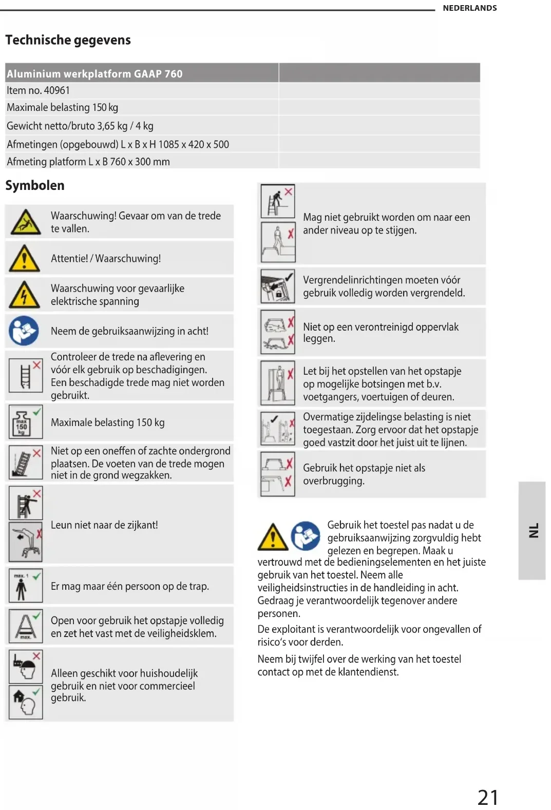 NEDERLANDS Beoogd gebruik Deze hoogwerker is een mobiel arbeidsmiddel dat op de meest uiteenlopende plaatsen kan worden gebruikt. Het kan worden gebruikt voor het uitvoeren van kleinschalige werkzaamheden op hoogte waar het gebruik van andere arbeidsmiddelen niet evenredig is (zie de Verordening inzake de veiligheid van arbeidsmiddelen). Het hefwerkplatform mag alleen worden gebruikt, zoals in deze gebruiksaanwijzing is beschreven; ieder ander gebruik geldt als niet in overeenstemming met de voorschriften. Er wordt geen aansprakelijkheid aanvaard voor schade veroorzaakt door oneigenlijk gebruik. Wijzigingen aan de trede die niet door de fabrikant zijn toegestaan, maken de garantie ongeldig. Veiligheidsvoorschriften voor ladders en trappen (werkplatforms)