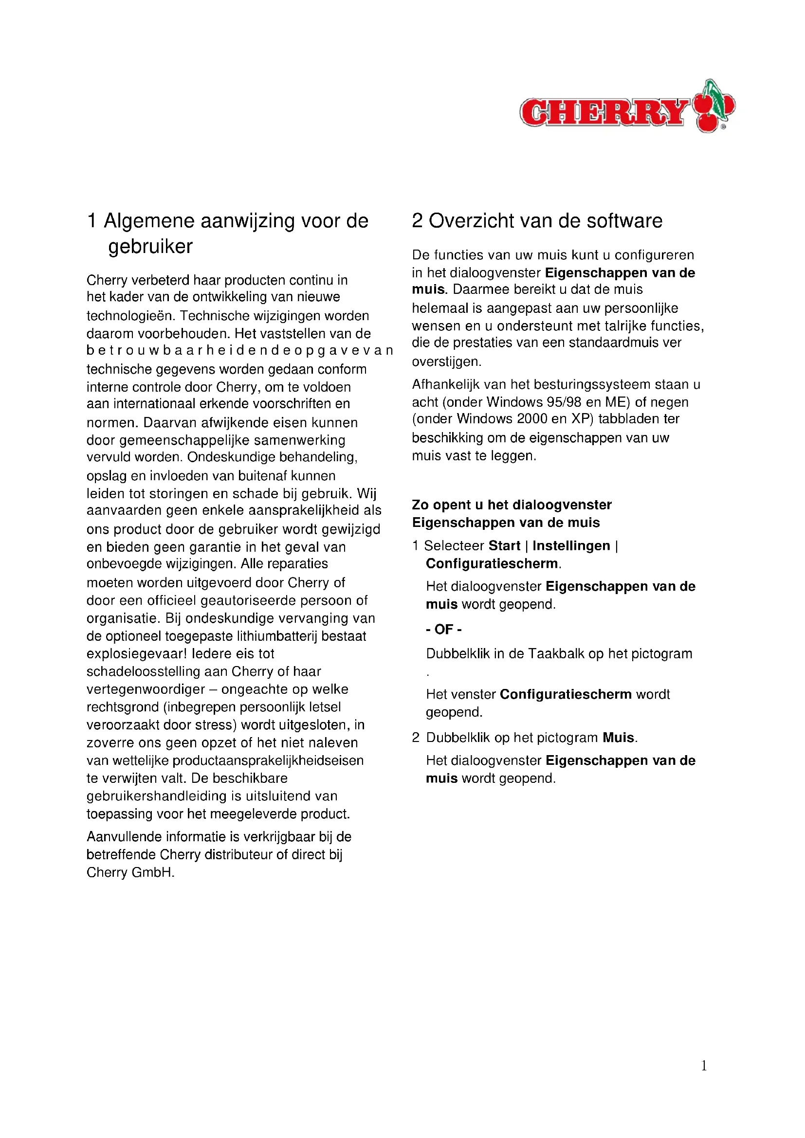 La ficha Hardware sólo aparece con el sistema operativo Windows 2000. En la ficha Hardware puede ver información sobre las propiedades del mouse o el estado del dispositivo y los controladores. Si se produce algún problema relacionado con la configuración actual del hardware, consulte la ayuda de Windows 2000. En ella se encuentra el solucionador de problemas mouse que le ayudará a solucionar el problema. Para consultar el solucionador de problemas del mouse en la ayuda de Windows 2000 1EnelgrupoDispositivos, seleccione el mouse cuyas propiedades ampliadas desee ver. 2 Haga clic en el botón Solución de problemas si desea abrir la ayuda de Windows 2000 sin ver más información sobre la configuración de hardware. Se abre el solucionador del mouse de la ayuda de Windows 2000. -OBIEN- Haga clic en el botón Propiedades. Se abre el cuadro de diálogo Propiedades de....LasfichasGeneral y Controladores muestran el estado del dispositivo e información sobre los controladores. 3 SienelcampoEstado del dispositivo apareceuncódigodeerror,hagaclicenel botón Solución de problemas. Se abre el solucionador del mouse de la ayuda de Windows 2000. 4 Nivel de carga del mouse (sólo para el modelo inalámbrico) Los iconos de la barra de estado le informarán sobre el nivel de carga de las pilas del mouse. El icono significa que las pilas están llenas; el icono significa que las pilas están vacías.Cherry PowerWheel Mouse optical Cherry PowerWheel Mouse wireless optical Handleiding 644-0273.00 März 20021 1 Algemene aanwijzing voor de gebruiker Cherry verbeterd haar producten continu in het kader van de ontwikkeling van nieuwe technologieën. Technische wijzigingen worden daarom voorbehouden. Het vaststellen van de betrouwbaarheidendeopgavevan technische gegevens worden gedaan conform interne controle door Cherry, om te voldoen aan internationaal erkende voorschriften en normen. Daarvan afwijkende eisen kunnen door gemeenschappelijke samenwerking vervuld worden. Ondeskundige behandeling, opslag en invloeden van buitenaf kunnen leiden tot storingen en schade bij gebruik. Wij aanvaarden geen enkele aansprakelijkheid als ons product door de gebruiker wordt gewijzigd en bieden geen garantie in het geval van onbevoegde wijzigingen. Alle reparaties moeten worden uitgevoerd door Cherry of door een officieel geautoriseerde persoon of organisatie. Bij ondeskundige vervanging van de optioneel toegepaste lithiumbatterij bestaat explosiegevaar! Iedere eis tot schadeloosstelling aan Cherry of haar vertegenwoordiger – ongeachte op welke rechtsgrond (inbegrepen persoonlijk letsel veroorzaakt door stress) wordt uitgesloten, in zoverre ons geen opzet of het niet naleven van wettelijke productaansprakelijkheidseisen te verwijten valt. De beschikbare gebruikershandleiding is uitsluitend van toepassing voor het meegeleverde product. Aanvullende informatie is verkrijgbaar bij de betreffende Cherry distributeur of direct bij Cherry GmbH. 2 Overzicht van de software De functies van uw muis kunt u configureren in het dialoogvenster Eigenschappen van de muis. Daarmee bereikt u dat de muis helemaal is aangepast aan uw persoonlijke wensen en u ondersteunt met talrijke functies, die de prestaties van een standaardmuis ver overstijgen. Afhankelijk van het besturingssysteem staan u acht (onder Windows 95/98 en ME) of negen (onder Windows 2000 en XP) tabbladen ter beschikking om de eigenschappen van uw muis vast te leggen. Zo opent u het dialoogvenster Eigenschappen van de muis 1 Selecteer Start | Instellingen | Configuratiescherm. Het dialoogvenster Eigenschappen van de muis wordt geopend. -OF- Dubbelklik in de Taakbalk op het pictogram