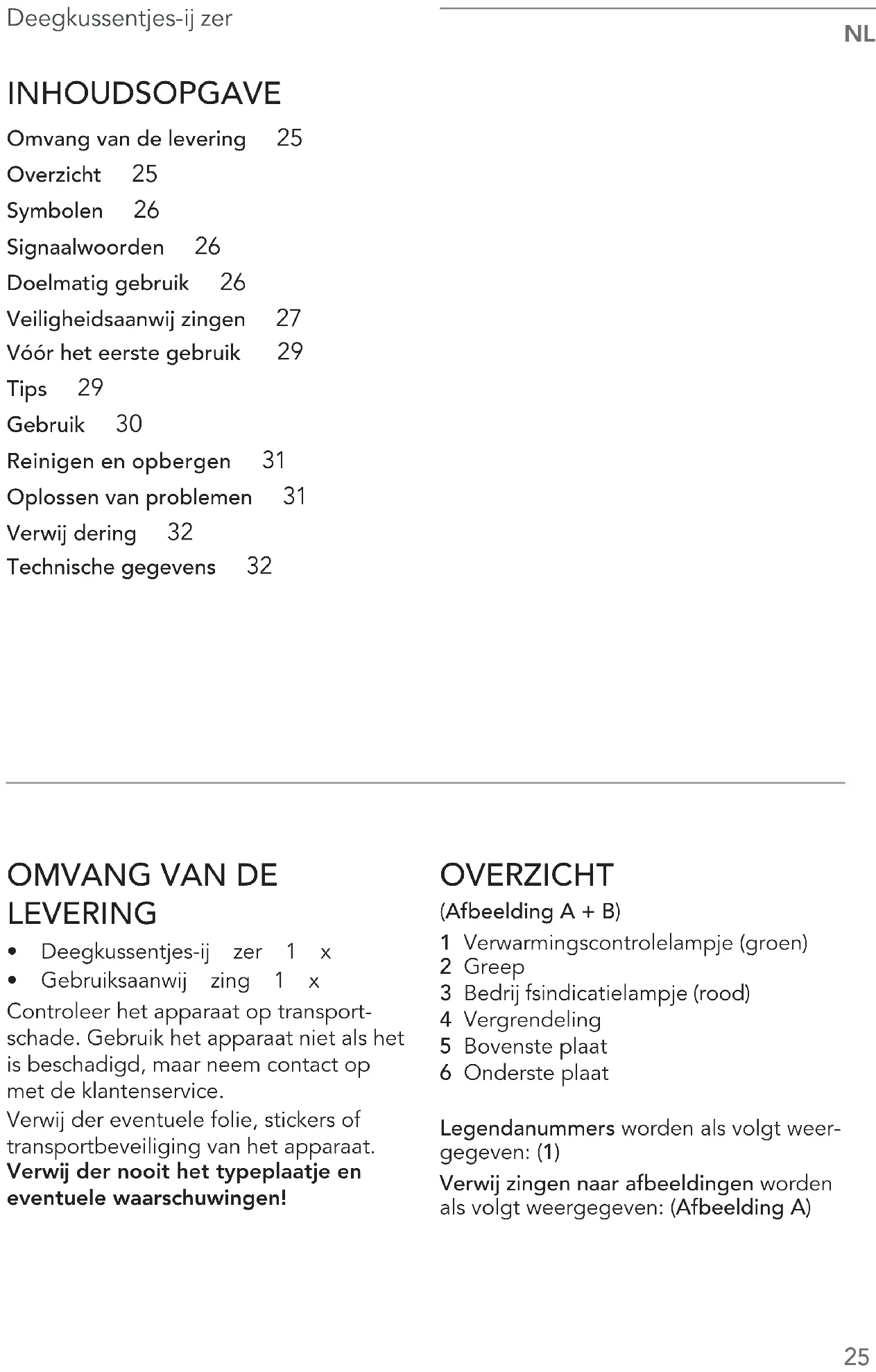 INHOUDSOPGAVE Omvang van de levering 25 Overzicht 25 Symbolen 26 Signaalwoorden 26 Doelmatig gebruik 26 Veiligheidsaanwij zingen 27 Vóór het eerste gebruik 29 Tips 29 Gebruik 30 Reinigen en opbergen 31 Oplossen van problemen 31 Verwij dering 32 Technische gegevens 32