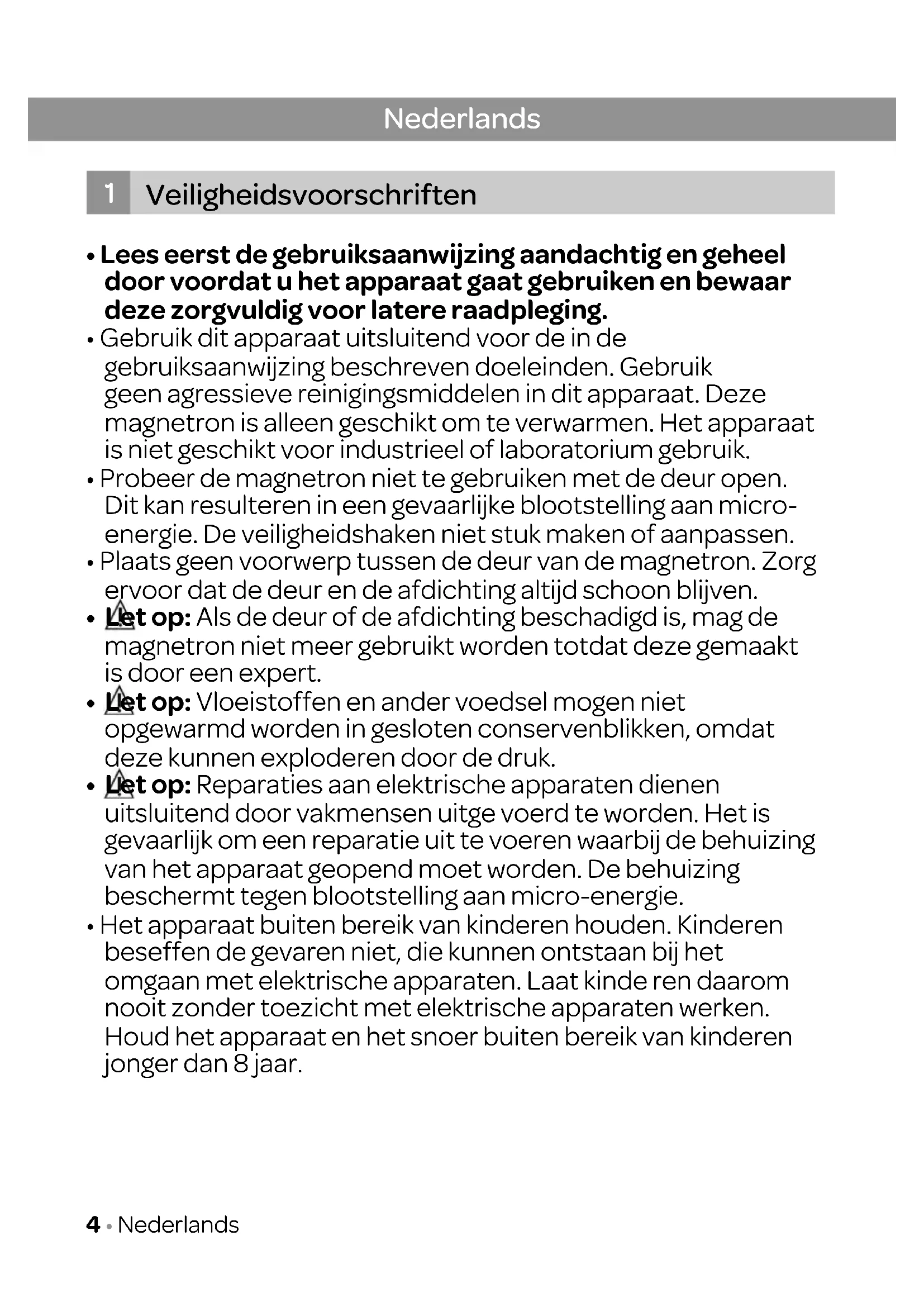 - Het apparaat buiten bereik van kinderen houden. Kinderen beseffen de gevaren niet, die kunnen ontstaan bij het omgaan met elektrische apparaten. Laat kinde ren daarom nooit zonder toezicht met elektrische apparaten werken. Houd het apparaat en het snoer buiten bereik van kinderen jonger dan 8 jaar. Nederlands Veiligheidsvoorschriften
