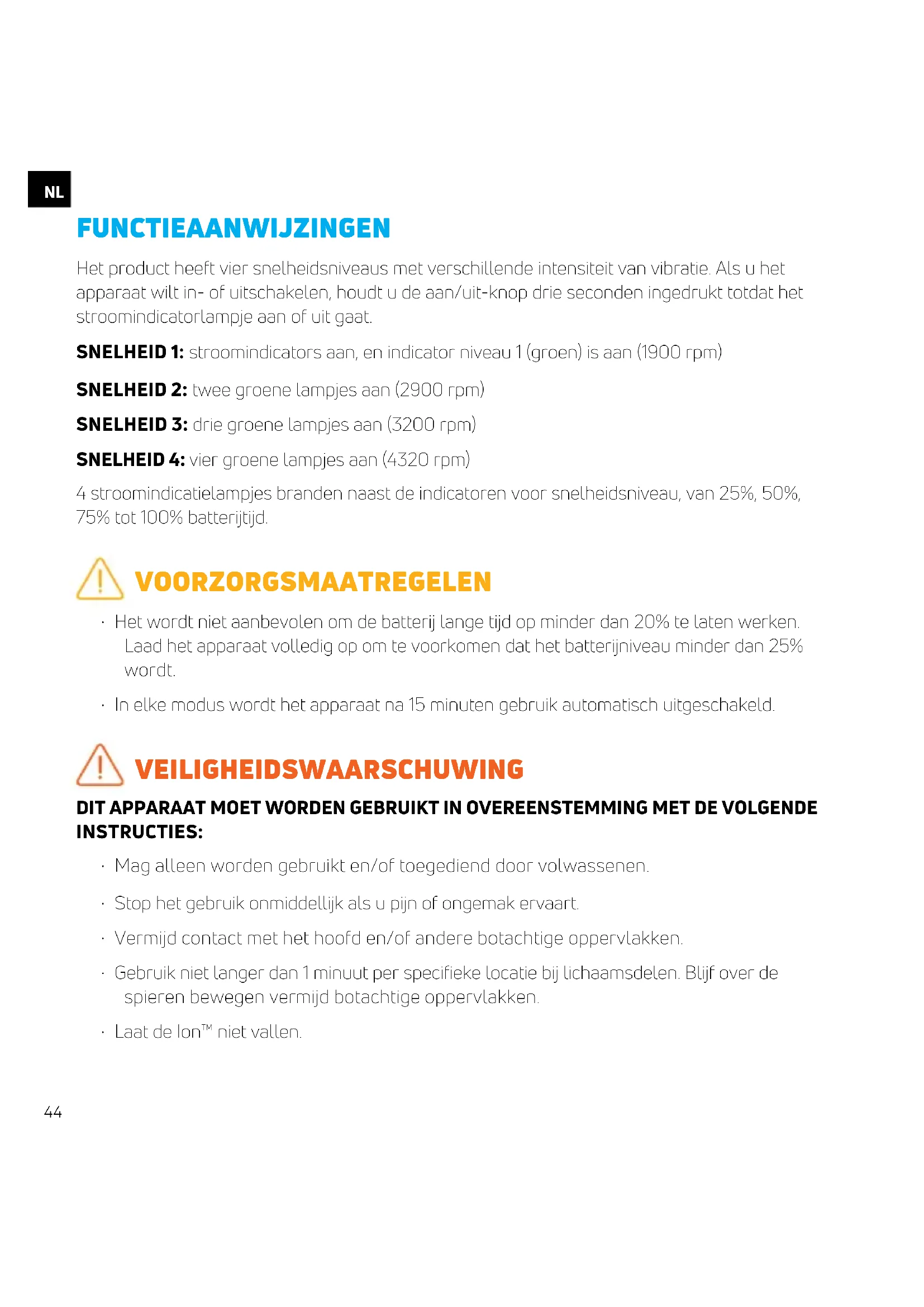 FUNCTIEAANWIJZINGEN Het product heeft vier snelheidsniveaus met verschillende intensiteit van vibratie. Als u het apparaat wilt in- of uitschakelen, houdt u de aan/uit-knop drie seconden ingedrukt totdat het stroomindicatorlampje aan of uit gaat. SNELHEID 1: stroomindicators aan, en indicator niveau 1 (groen) is aan (1900 rpm) SNELHEID 2: twee groene lampjes aan (2900 rpm) SNELHEID 3: drie groene lampjes aan (3200 rpm) SNELHEID 4: vier groene lampjes aan (4320 rpm) 4 stroomindicatielampjes branden naast de indicatoren voor snelheidsniveau, van 25%, 50%, 75% tot 100% batterijtijd. VOORZORGSMAATREGELEN