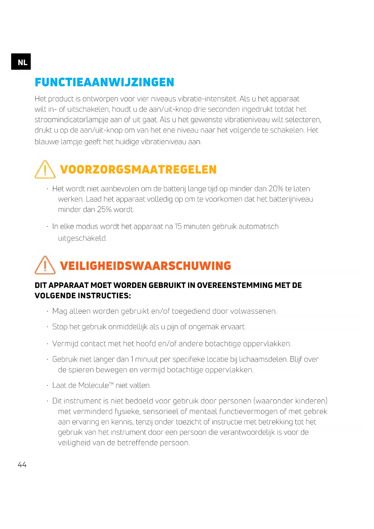 BIJWERKINGEN U kunt huidirritatie en lichte bloeduitstortingen ervaren als u de Molecule™ meer dan 60 seconden op dezelfde plaats of op botachtige oppervlakken gebruikt. Bijwerkingen kunnen worden ervaren door mensen die herstellende zijn van een operatie of die huidaandoeningen, wonden, zenuwaandoeningen, botbreuken en/of kneuzingen hebben. Om reacties te voorkomen moeten gebruikers een arts raadplegen alvorens de Molecule™ te gebruiken.