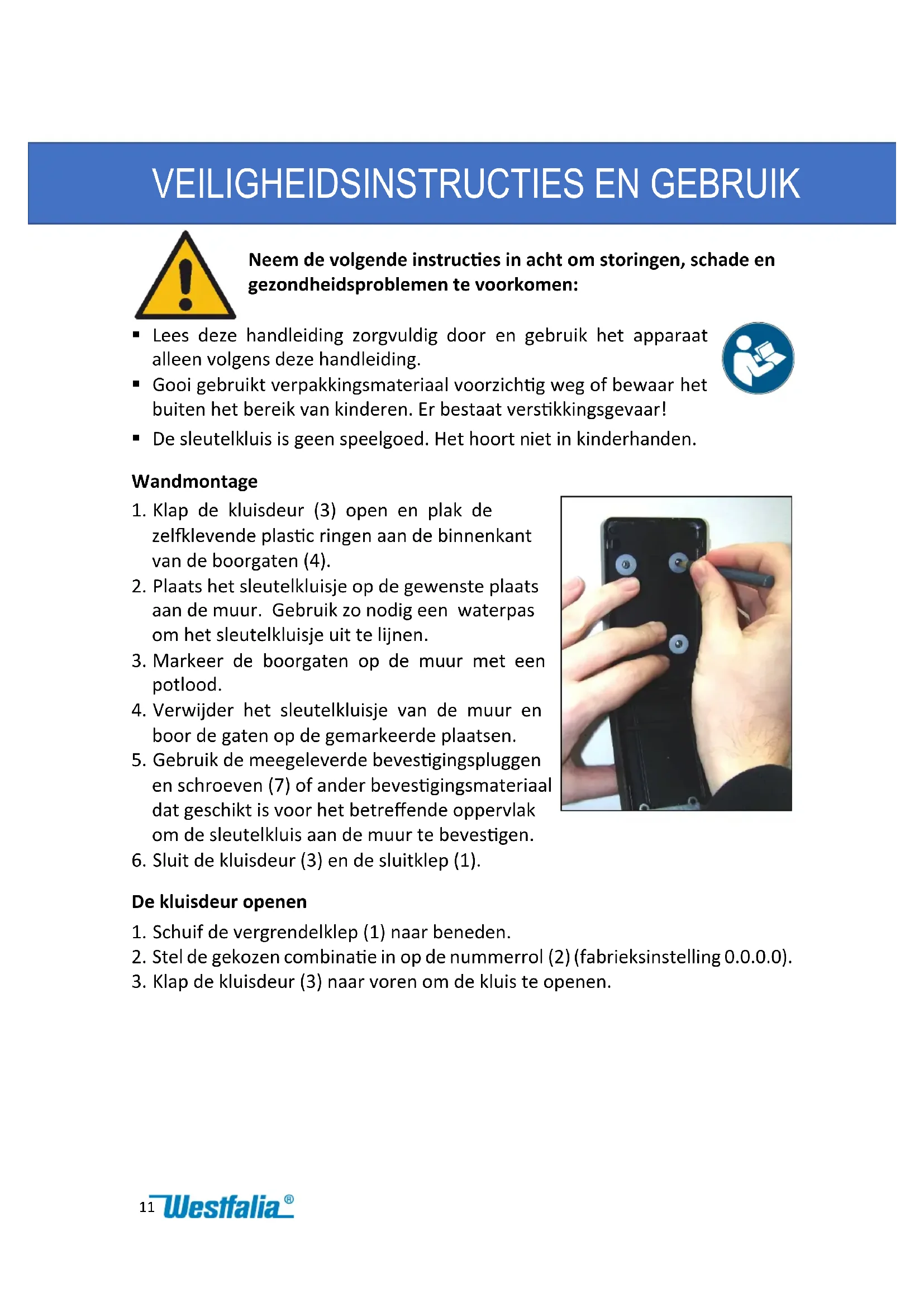 B11 Neem de volgende instructies in acht om storingen, schade en gezondheidsproblemen te voorkomen: Lees deze handleiding zorgvuldig door en gebruik het apparaat alleen volgens deze handleiding. Gooi gebruikt verpakkingsmateriaal voorzichtig weg of bewaar het buiten het bereik van kinderen. Er bestaat verstikkingsgevaar! De sleutelkluis is geen speelgoed. Het hoort niet in kinderhanden. Wandmontage