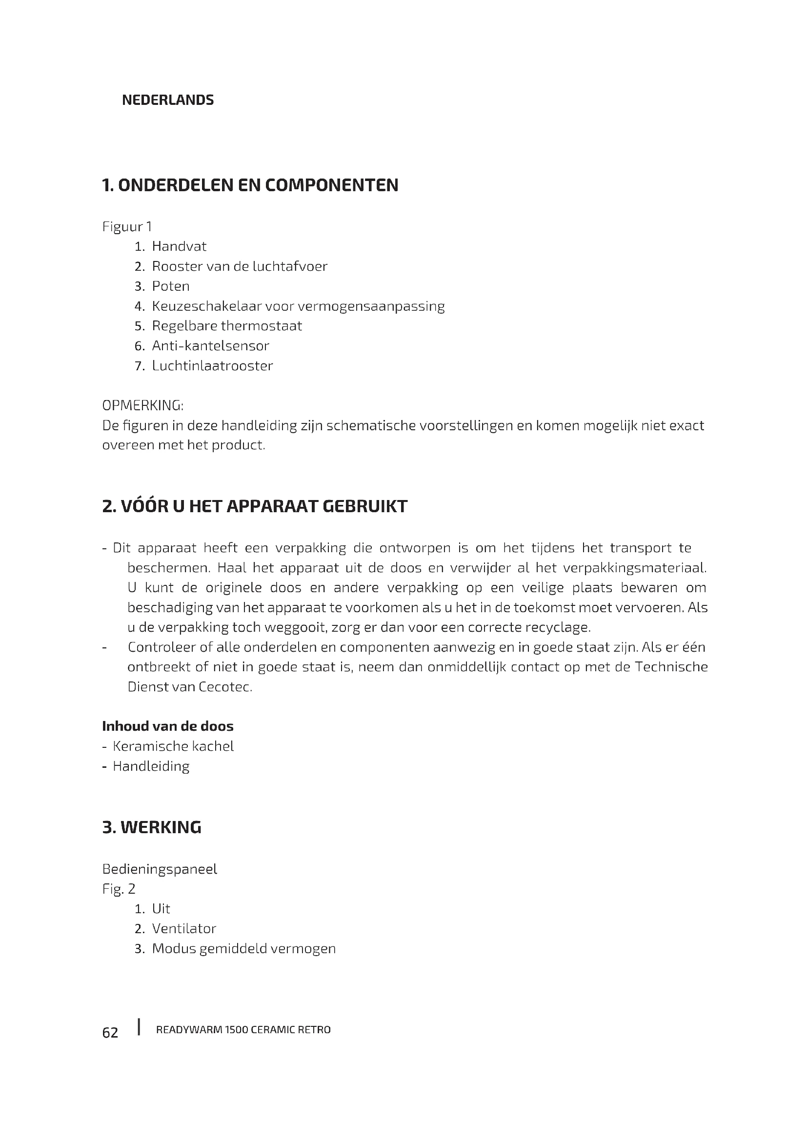 alleen in- en uitschakelen als het in de normale gebruiksstand is geplaatst of geïnstalleerd en als ze toezicht of instructies hebben gekregen over het veilige gebruik van het apparaat en de gevaren begrijpen. Kinderen vanaf 3 jaar en jonger dan 8 jaar mogen het apparaat niet aansluiten, regelen en reinigen of onderhoudswerkzaamheden uitvoeren. - LET OP: Sommige onderdelen van dit product kunnen zeer heet worden en brandwonden veroorzaken. Er moet bijzondere aandacht worden besteed aan kinderen en kwetsbare personen. - WAARSCHUWING: Gebruik dit verwarmingsapparaat niet in kleine ruimtes die worden bewoond door personen die de ruimte niet alleen kunnen verlaten, tenzij er permanent toezicht is. - WAARSCHUWING: Houd textiel, gordijnen of ander brandbaar materiaal op minstens 1 m afstand van de luchtuitlaat om het risico op brand te verminderen. - Steek geen voorwerpen in de ventilatieopeningen en zorg dat deze er niet in kunnen komen, want dit kan leiden tot elektrische schokken, brand of schade aan het apparaat. - Dompel het snoer, de stekker of andere niet-verwijderbare onderdelen van het apparaat niet onder in water of andere vloeistoen. Stel de elektrische verbindingen niet bloot aan water. Zorg er altijd voor dat uw handen droog zijn voordat u schakelaars op het product bedient of afstelt of de stekker en het stopcontact aanraakt. - Laat het apparaat niet onbeheerd achter als het is ingeschakeld. - Een van de meest voorkomende oorzaken van oververhitting is de ophoping van stof of pluis in het apparaat. Zorg ervoor dat u deze ophopingen regelmatig reinigt door de ventilatieopeningen en roosters te stofzuigen.READYWARM 1500 CERAMIC RETRO