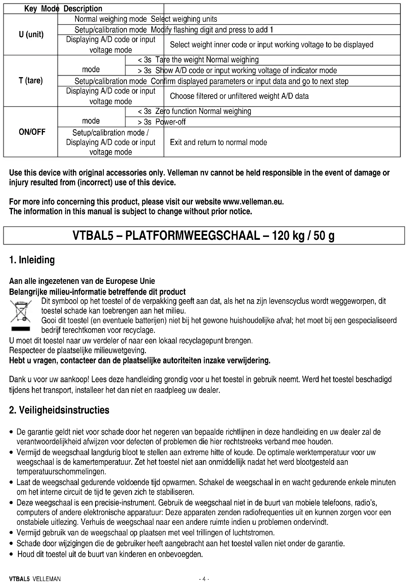 Toets Modus Omschrijving Normale weegmodus Selecteer de weegeenheid Instel-/ijkingmodus Wijzig de knipperende digit en druk op de toets om de waarde met 1 te vermeerderen U (eenheid) Weergave van de A/D-code of ingangspanning Selecteer interne gewichtcode of ingangspanning < 3s Gewicht tarreren Normale weeg- modus > 3s Geef A/D-code of ingangspanning weer Instel-/ijkingmodus Bevestig de weergegeven parameters of ingangdata en ga naar de volgende stap T (tarra) Weergave van de A/D-code of ingangspanning Kies voor gefilterde of niet-gefilterde A/D-data < 3s Nulpuntfunctie Normale weeg- modus > 3s Uitschakeling ON/OFF Instel-/ijkingmodus / weergave van de A/D-code of ingangspanning Menu verlaten en naar normale modus terugkeren Gebruik dit toestel enkel met originele accessoires. Velleman nv is niet aansprakelijk voor schade of kwetsuren bij (verkeerd) gebruik van dit toestel. Voor meer informatie omtrent dit product, zie www.velleman.eu. De informatie in deze handleiding kan te allen tijde worden gewijzigd zonder voorafgaande kennisgeving.VTBAL5 VELLEMAN