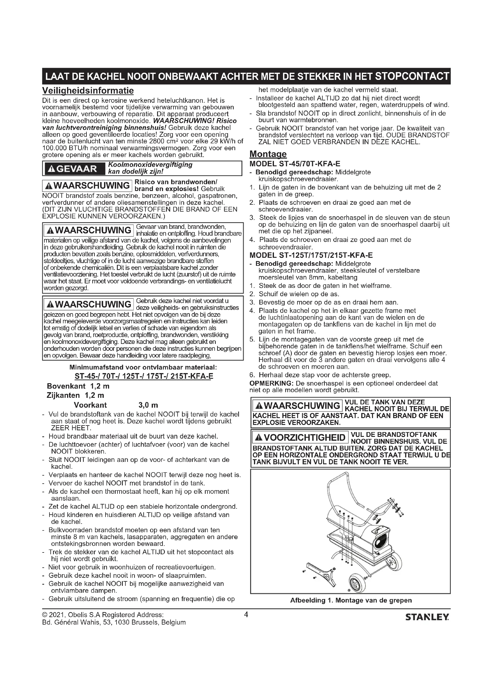 1. Wacht tien seconden nadat u de kachel uitgezet hebt.2. Zet de stroomschakelaar op ‘AAN’.3. Neem alle voorzorgsmaatregelen voor de startprocedure in acht. LANGDURIGE OPSLAG Brandstoftank aftappen1. Op model ST-45/70T-KFA-E moet de brandstof via de vulopening worden afgetapt met een daarvoor goedgekeurde hevelfles. Op model ST-125/175/215-KFA-E moet de brandstof via de afvoerplug onderop de brandstoftank worden afgetapt.2. Om de aftapplug (125/175/215) te verwijderen, trekt u de pluggreep omlaag en verwijdert u de afdichtkop uit het aftapgat in de tank.3. Spoel de tank en leeg deze helemaal.4. Druk de aftapkop helemaal in het aftapgat en zet hem vast door de afdichtdop helemaal in het gat in de kop te drukken om de aftapplug terug te plaatsen.BELANGRIJK: Laat brandstof nooit tijdens de zomer in de tank zitten. De kachel kan door gebruik van oude brandstof beschadigd raken.Sla de kachel op een droge en goed geventileerde plaats op. Als de kachel niet binnen kan worden opgeslagen, moet u een zeil of waterdichte hoes gebruiken om de kachel te beschermen.Zorg dat de opslagplaats vrij is van stof en corrosieve dampen. Verpak de kachel weer in het oorspronkelijke verzendmateriaal. Bewaar de gebruikershandleiding op een goed toegankelijke plaats. Onderhoud Verricht kachelonderhoud altijd op een schone, vlakke, droge locatie. Verricht nooit onderhoud aan de kachel terwijl de stekker in het stopcontact is gestoken of de kachel heet is!Verricht nooit onderhoud aan de kachel onder natte omstandigheden. Zorg bij onderhoud in noodgevallen dat de kachel helemaal is afgekoeld zodat u deze met een zeil of waterdichte hoes kunt afdekken om te voorkomen dat de kachel of elektronica binnenin nat worden. Verricht onder geen beding onderhoud aan de kachel terwijl de stekker in het stopcontact is gestoken.BRANDSTOF/BRANDSTOFTANK: Spoel de brandstoftank om de 200 bedrijfsuren of naar vereist met kerosine.LUCHTFILTERS: Open het deksel van de kachel om toegang tot de filters te verkrijgen. De filters moeten om de 500 bedrijfsuren of vaker worden vervangen, afhankelijk van de omstandigheden. Zie afbeelding 7.1 op pagina 8 voor een gedetailleerde afbeelding.VENTILATORBLADEN: Open het deksel van de kachel om toegang tot de ventilatorbladen te verkrijgen. De ventilatorbladen moeten ten minste eenmaal per verwarmingsseizoen schoongemaakt worden. Zie afbeelding 6.1 op pagina 8 voor een gedetailleerde afbeelding.SPROEIERS: Open het deksel van de kachel en verwijder de branderkop om toegang tot de sproeiers te verkrijgen. De sproeiers moeten ten minste eenmaal per verwarmingsseizoen schoongemaakt of vervangen worden. Zie afbeelding 3.1 op pagina 8 voor een gedetailleerde afbeelding.BOUGIE: Open het deksel van de kachel om toegang tot de bougie te verkrijgen. Maak de bougie schoon en corrigeer de elektrodenafstand om de 600 bedrijfsuren of vervang hem indien nodig. Stel de elektrodenafstand af op 3,5 mm. Zie afbeelding 3.1 op pagina 8 voor een gedetailleerde afbeelding.FOTOCEL: Open het deksel van de kachel om toegang tot de fotocel te verkrijgen. De fotocel moet ten minste eenmaal per verwarmingsseizoen worden schoongemaakt, of vaker als de omstandigheden dat vereisen. Zie afbeelding 4.1 en 5.1 op pagina 8 voor een gedetailleerde afbeelding.Na onderhoud van de kachel moet de volgende werkingscontrole worden uitgevoerd voordat deze kachel weer in gebruik wordt gesteld: - inspecteer de lucht- en brandstofleidingen op eventuele lekken met een oplossing van gelijke delen water en zeep. - inspecteer het verlengsnoer op tekenen van slijtage, barsten of inkepingen - controleer of de ontstekingskabels goed op de bougie zijn vastgezetBij slecht onderhoud zal de verbranding minder efficiënt verlopen en kan er roet ontstaan. De kachel mag onder geen beding gewijzigd of aangepast worden. Gebruik voor onderhoud en reparatie van de kachel uitsluitend originele onderdelen van de fabrikant of leverancier, en neem contact op met de fabrikant of leverancier voordat u onderdelen vervangt door onderdelen die niet gespecificeerd of aanbevolen worden.REGELING VAN DE POMPDRUK:Zorg dat de kachel aanstaat en draai de ontlastingsklep rechtsom om de pompdruk te verhogen, of linksom om de pompdruk te verlagen. Gebruik een bladschroevendraaier om de ontlastingsklep te verstellen. De juiste pompdruk staat vermeld op pagina 4. Dit toestel is niet bestemd voor gebruik door personen (kinderen inbegrepen) met beperkt fysiek, zintuiglijk of mentaal vermogen of gebrek aan ervaring en kennis, tenzij ze onder toezicht staan of instructies over het toestel krijgen van een persoon die verantwoordelijk is voor hun veiligheid. Kinderen moeten onder toezicht staan om te verzekeren dat ze niet met het toestel spelen. Als het snoer beschadigd raakt, moet het worden vervangen door de fabrikant, diens service-agent of andere bevoegde personen om gevaren te voorkomen. Afbeelding 2. Start de kachel Aan/uit-schakelaar Ledje bedrijfstijd/ temperatuur Temperatuurknop Ledje - brandstofmeter6 LAAT DE KACHEL NOOIT ONBEWAAKT ACHTER MET DE STEKKER IN HET STOPCONTACT © 2021, Obelis S.A Registered Address: Bd. Général Wahis, 53, 1030 Brussels, Belgium