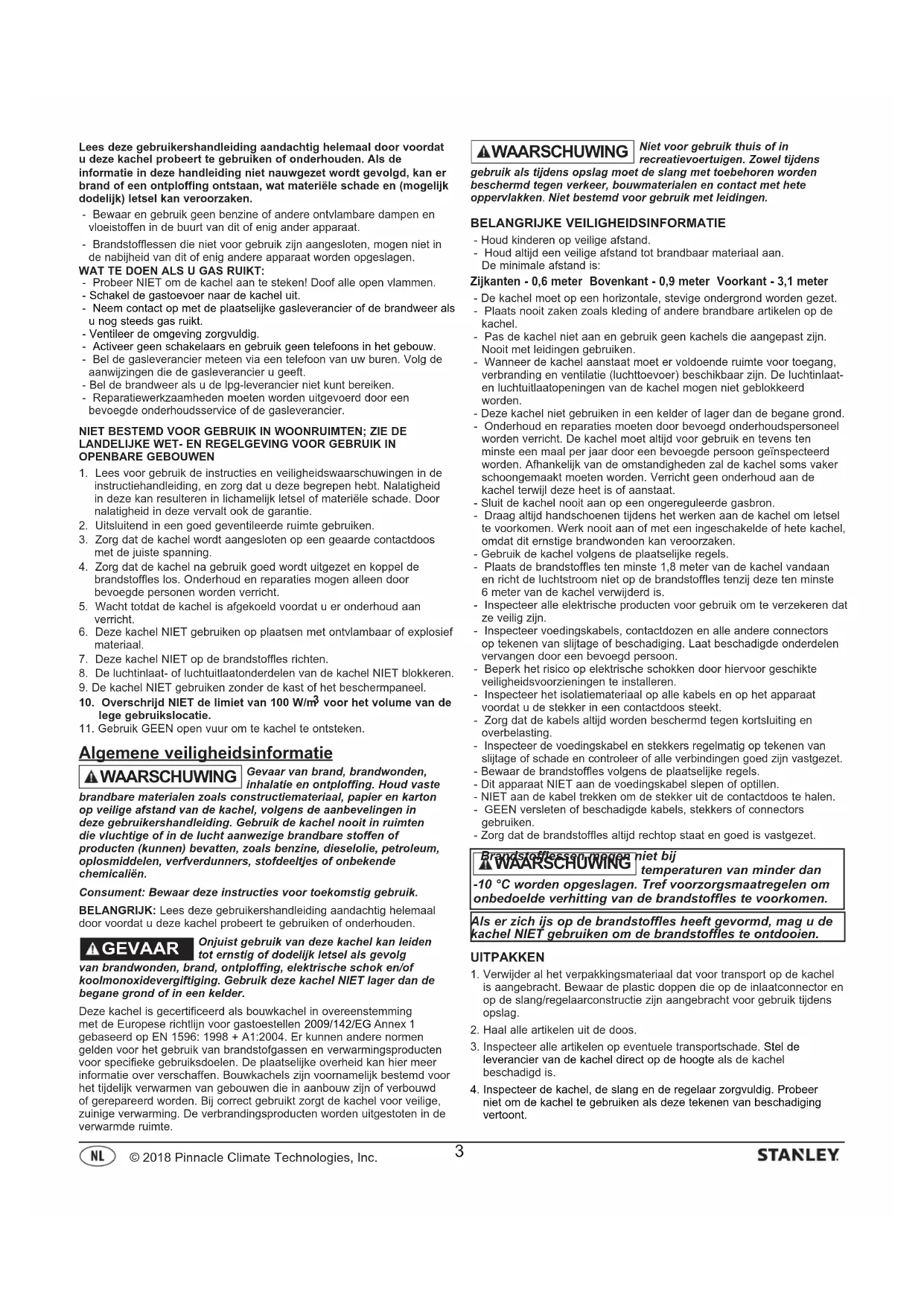 BL. BLAUW RD. ROOD BK. ZWART WT. WIT GN. GROEN YN. GEEL© 2018 Pinnacle Climate Technologies, Inc. Lees deze gebruikershandleiding aandachtig helemaal door voordat u deze kachel probeert te gebruiken of onderhouden. Als de informatie in deze handleiding niet nauwgezet wordt gevolgd, kan er brand of een ontploffing ontstaan, wat materiële schade en (mogelijk dodelijk) letsel kan veroorzaken. - Bewaar en gebruik geen benzine of andere ontvlambare dampen en vloeistoffen in de buurt van dit of enig ander apparaat. - Brandstofflessen die niet voor gebruik zijn aangesloten, mogen niet in de nabijheid van dit of enig andere apparaat worden opgeslagen. WAT TE DOEN ALS U GAS RUIKT: - Probeer NIET om de kachel aan te steken! Doof alle open vlammen. - Schakel de gastoevoer naar de kachel uit. - Neem contact op met de plaatselijke gasleverancier of de brandweer als u nog steeds gas ruikt. - Ventileer de omgeving zorgvuldig. - Activeer geen schakelaars en gebruik geen telefoons in het gebouw. - Bel de gasleverancier meteen via een telefoon van uw buren. Volg de aanwijzingen die de gasleverancier u geeft. - Bel de brandweer als u de lpg-leverancier niet kunt bereiken. - Reparatiewerkzaamheden moeten worden uitgevoerd door een bevoegde onderhoudsservice of de gasleverancier. NIET BESTEMD VOOR GEBRUIK IN WOONRUIMTEN; ZIE DE LANDELIJKE WET- EN REGELGEVING VOOR GEBRUIK IN OPENBARE GEBOUWEN