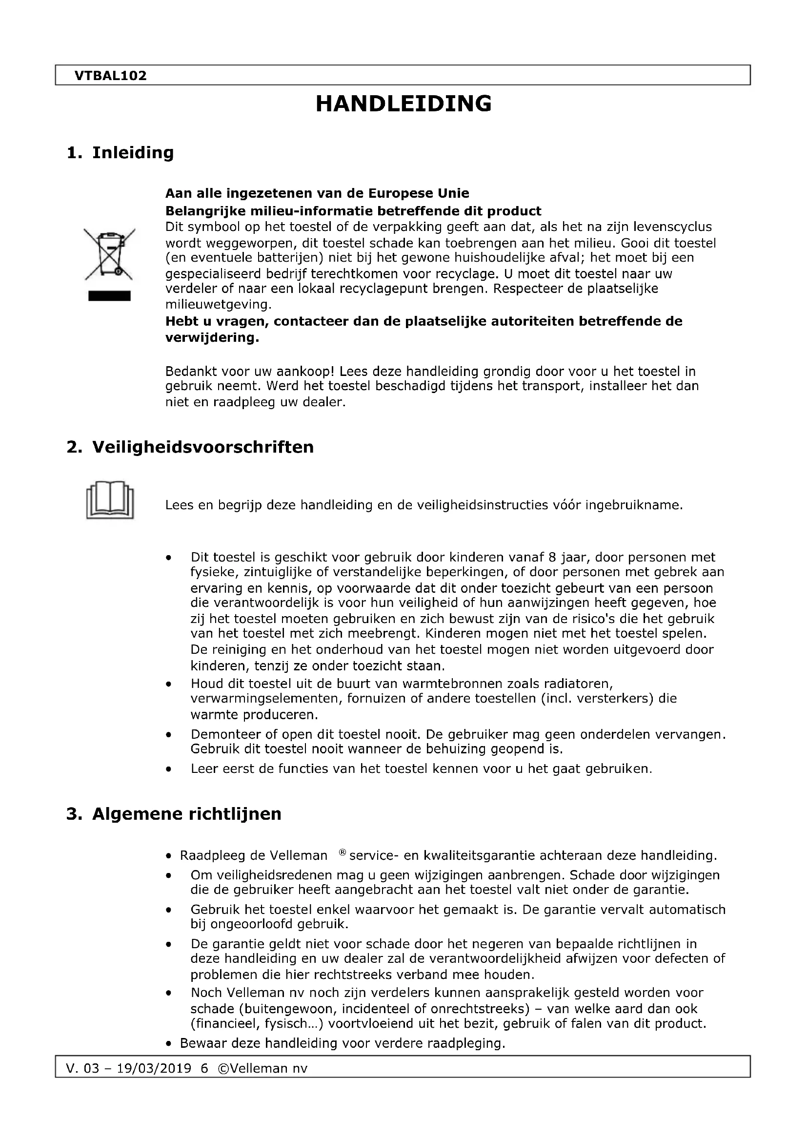 Velleman nv heeft het auteursrecht voor deze handleiding. Alle wereldwijde rechten voorbehouden. Het is niet toegestaan om deze handleiding of gedeelten ervan over te nemen, te kopiëren, te vertalen, te bewerken en op te slaan op een elektronisch medium zonder voorafgaande schriftelijke toestemming van de rechthebbende.VTBAL102