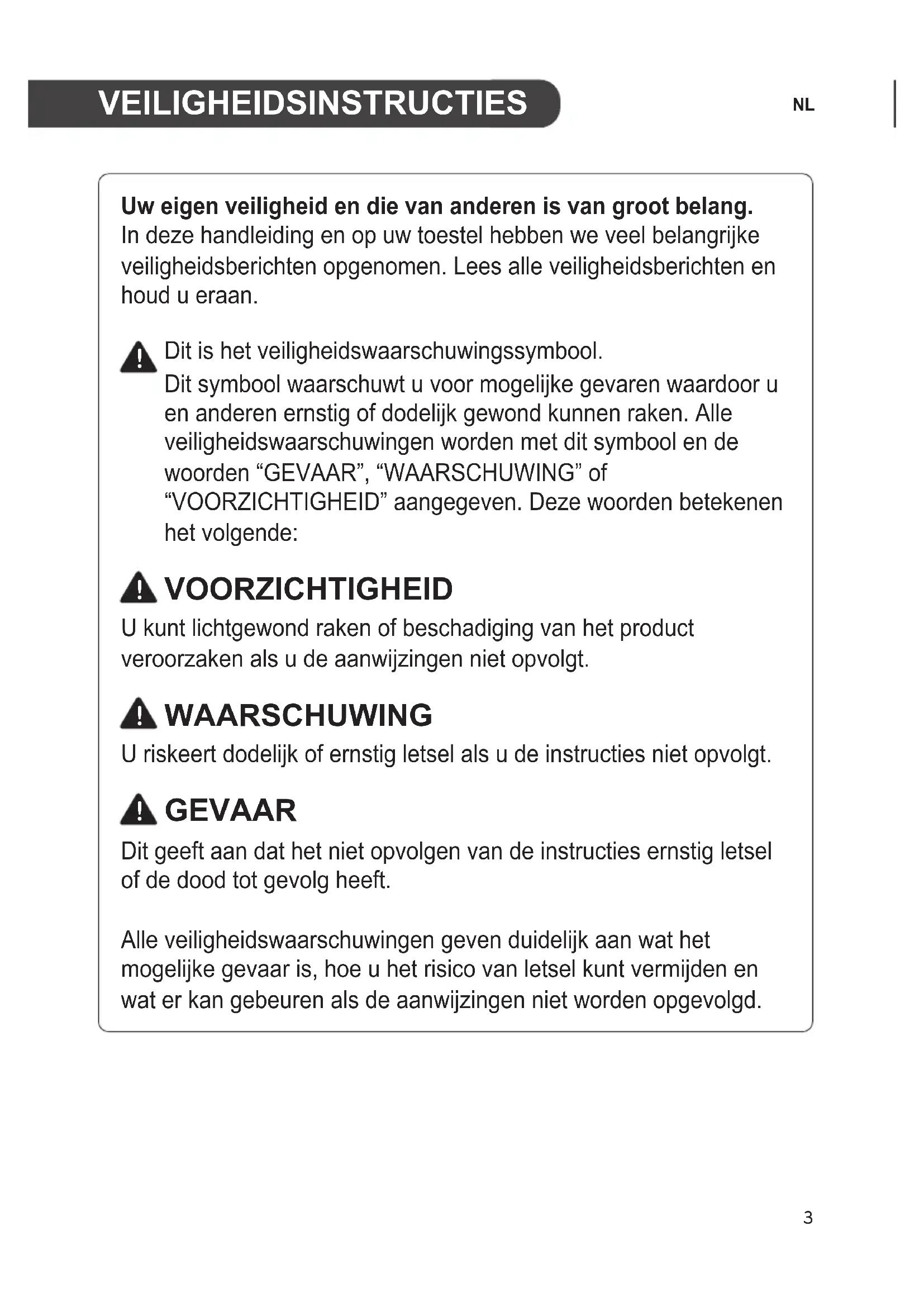 - Оваа карактеристика може да е подложна на промени без претходно предупредување, а може да има и различна форма во зависност од вашата локација.www.lg.com GEBRUIKERSHANDLEIDING WARMTEPOMP -WATERVERWARMER Copyright © 2023 LG Electronics Inc. Alle rechten voorbehouden. Oorspronkelijke instructies NL NEDERLANDS Lees deze handleiding aandachtig door voordat u het apparaat gebruikt en houd deze te allen tijde binnen handbereik.INHOUDSOPGAVE VEILIGHEIDSINSTRUCTIES ...........................................3 Veiligheidsvoorzorg ..................................................................................................4 INSTALLATIE .................................................................12 Onderdelen en functies ..........................................................................................12 Installatiegereedschappen .....................................................................................13 Accessoires............................................................................................................13 Installatie-instructies...............................................................................................14 Selecteer de beste locatie......................................................................................15 Uitpakken en verwijderen van verzendbouten .......................................................16 Thermische expansie .............................................................................................16 Installeren van de afvoerklep .................................................................................16 Installeren van T&P ontlastingsklep .......................................................................16 Installeren van condensaatafvoerleidingen............................................................18 Aansluiten van de watertoevoerslang ....................................................................19 Het maken van elektrische verbindingen ...............................................................20 Veiligheidscontroles ...............................................................................................21 Isolatiedekensets ...................................................................................................21 Installatiechecklist ..................................................................................................22 BEDIENING ....................................................................23 Gebruik van de basisbediening..............................................................................23 INTELLIGENTE FUNCTIES ...........................................25 LG ThinQ Applicatie ...............................................................................................25 Deze handleiding kan afbeeldingen of inhoud bevatten die verschillen van het aangeschafte model. Deze handleiding is onderhevig aan herziening door de fabrikant.NL VEILIGHEIDSINSTRUCTIES Uw eigen veiligheid en die van anderen is van groot belang. In deze handleiding en op uw toestel hebben we veel belangrijke veiligheidsberichten opgenomen. Lees alle veiligheidsberichten en houd u eraan. Dit is het veiligheidswaarschuwingssymbool. Dit symbool waarschuwt u voor mogelijke gevaren waardoor u en anderen ernstig of dodelijk gewond kunnen raken. Alle veiligheidswaarschuwingen worden met dit symbool en de woorden “GEVAAR”, “WAARSCHUWING” of “VOORZICHTIGHEID” aangegeven. Deze woorden betekenen het volgende: VOORZICHTIGHEID U kunt lichtgewond raken of beschadiging van het product veroorzaken als u de aanwijzingen niet opvolgt. WAARSCHUWING U riskeert dodelijk of ernstig letsel als u de instructies niet opvolgt. GEVAAR Dit geeft aan dat het niet opvolgen van de instructies ernstig letsel of de dood tot gevolg heeft. Alle veiligheidswaarschuwingen geven duidelijk aan wat het mogelijke gevaar is, hoe u het risico van letsel kunt vermijden en wat er kan gebeuren als de aanwijzingen niet worden opgevolgd.