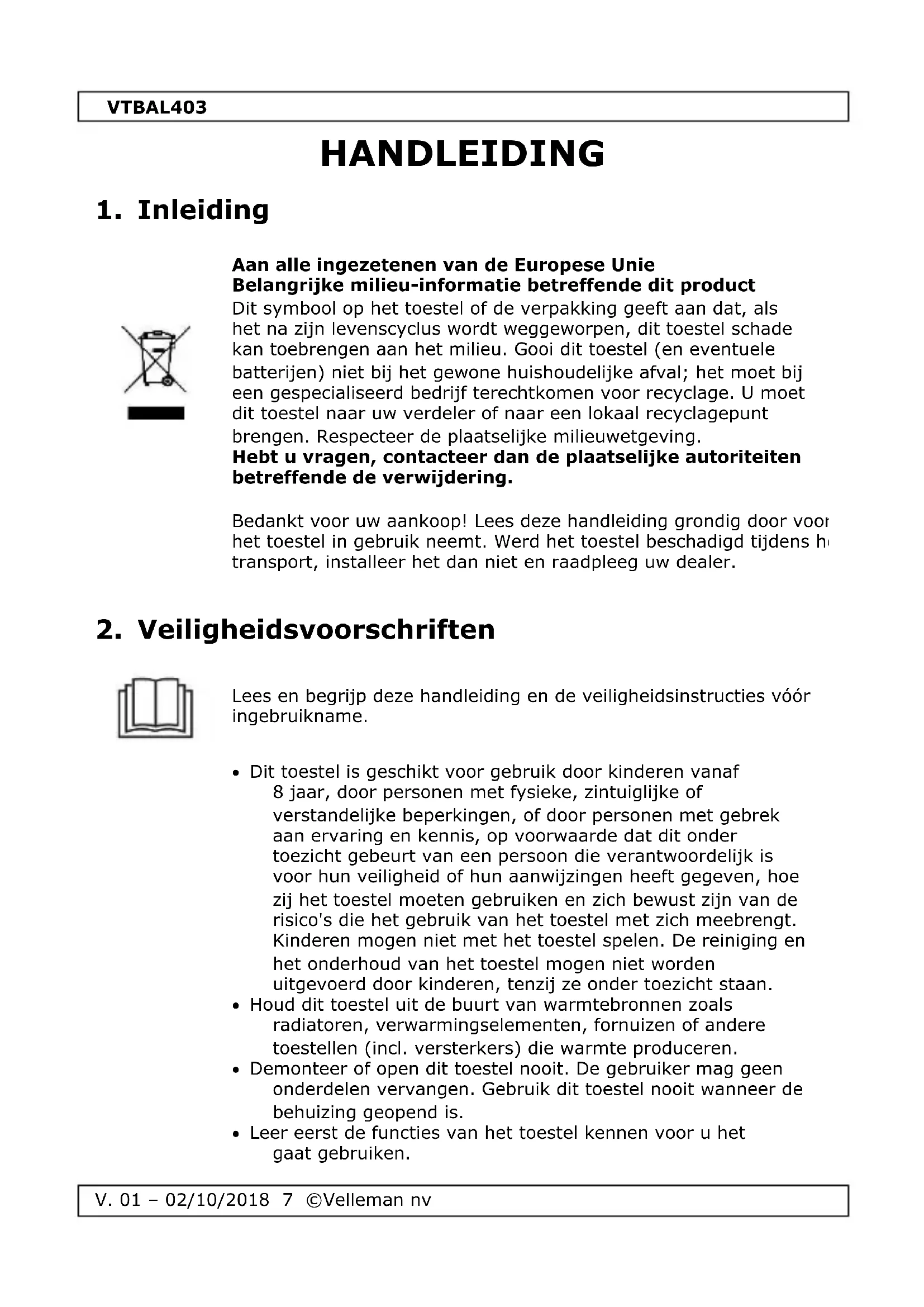 V. 01 – 02/10/2018 8 ©Velleman nv