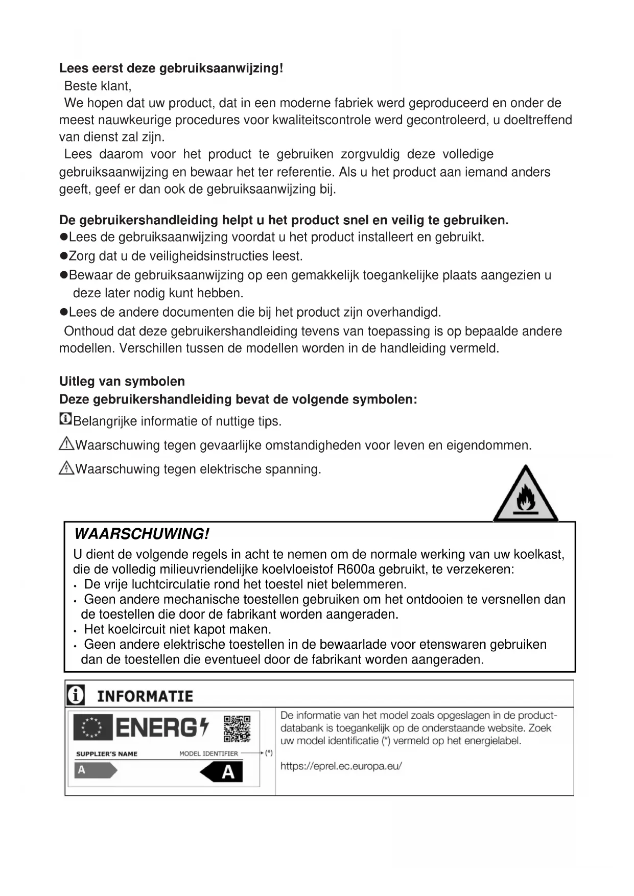 - Il se peut que les denrées touchent le plafond du tiroir. >>>Disposez à nouveau les denrées dans le tiroir. 20 FRLees eerst deze gebruiksaanwijzing! Beste klant, We hopen dat uw product, dat in een moderne fabriek werd geproduceerd en onder de meest nauwkeurige procedures voor kwaliteitscontrole werd gecontroleerd, u doeltreffend van dienst zal zijn. Lees daarom voor het product te gebruiken zorgvuldig deze volledige gebruiksaanwijzing en bewaar het ter referentie. Als u het product aan iemand anders geeft, geef er dan ook de gebruiksaanwijzing bij. De gebruikershandleiding helpt u het product snel en veilig te gebruiken. Lees de gebruiksaanwijzing voordat u het product installeert en gebruikt. Zorg dat u de veiligheidsinstructies leest. Bewaar de gebruiksaanwijzing op een gemakkelijk toegankelijke plaats aangezien u deze later nodig kunt hebben. Lees de andere documenten die bij het product zijn overhandigd. Onthoud dat deze gebruikershandleiding tevens van toepassing is op bepaalde andere modellen. Verschillen tussen de modellen worden in de handleiding vermeld. Uitleg van symbolen Deze gebruikershandleiding bevat de volgende symbolen: Belangrijke informatie of nuttige tips. Waarschuwing tegen gevaarlijke omstandigheden voor leven en eigendommen. Waarschuwing tegen elektrische spanning. WAARSCHUWING! U dient de volgende regels in acht te nemen om de normale werking van uw koelkast, die de volledig milieuvriendelijke koelvloeistof R600a gebruikt, te verzekeren: De vrije luchtcirculatie rond het toestel niet belemmeren. Geen andere mechanische toestellen gebruiken om het ontdooien te versnellen dan de toestellen die door de fabrikant worden aangeraden. Het koelcircuit niet kapot maken. Geen andere elektrische toestellen in de bewaarlade voor etenswaren gebruiken dan de toestellen die eventueel door de fabrikant worden aangeraden.INHOUD 2 NL 1 Uw koelkast 34 2 Belangrijke veiligheidswaarschuwingen 4 Bedoeld gebruik 4 Algemene veiligheid 4 Voor producten met een waterdispenser 6 Kinderbeveiliging 6 Voldoet aan de WEEE-richtlijn en de richtlijnen voor afvoeren van het restproduct 6 Verpakkingsinformatie 7 HCA-waarschuwing 7 Aanwijzingen ter besparing van energie 7 3 Installatie 8 Punten waarop gelet moet worden bij de verplaatsing van een koelkast 8 Voordat u de koelkast inschakelt 8 Elektrische aansluiting 8 Afvoeren van de verpakking 8 Afvoeren van uw oude koelkast 9 Plaatsing en installatie 9 Het vervangen van de lamp 9 De openingsrichting van de deur Wijzigen 9 Stelvoetjes aanpassen 9 4 Voorbereiding 10 5 Gebruik van uw koelkast 11 Indicatorpaneel 11 Tweeledig koelsysteem 13 HarvestFresh 13 Verse levensmiddelen invriezen 14 Vak voor beperkt houdbaar voedsel 14 Aanbeveling voor het bewaren van diepvriesvoedsel 15 Ontdooien 15 Het plaatsen van de Levensmiddelen 15 Diepvriesinformatie 16 Aanbevelingen voor het gedeelte 16 6 Onderhoud en reiniging 17 Bescherming van de plastic oppervlakken 17 7 Probleemoplossing 18 Dit product is uitgerust met een lichtbron van de "G"-energieklasse.De lichtbron in dit product mag enkel worden vervangen door professionele reparateurs.Uw koelkast
