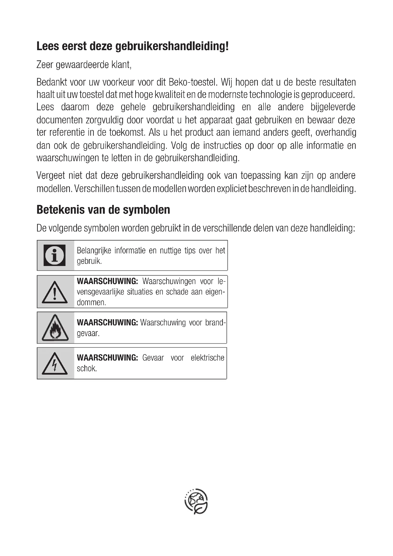 - Beko-producten voldoen aan de van toepassing zijnde veilighe- idsnormen; daarom moet in het geval van beschadiging aan het apparaat of het stroomsnoer dit worden gerepareerd of vervan- gen door de dealer, het servi- cecentrum of een specialist en erkende service om elk gevaar te vermijden. Verkeerd of niet- gekwalificeerd reparatiewerk kan gevaarlijk zijn en een risico vormen voor de gebruiker.