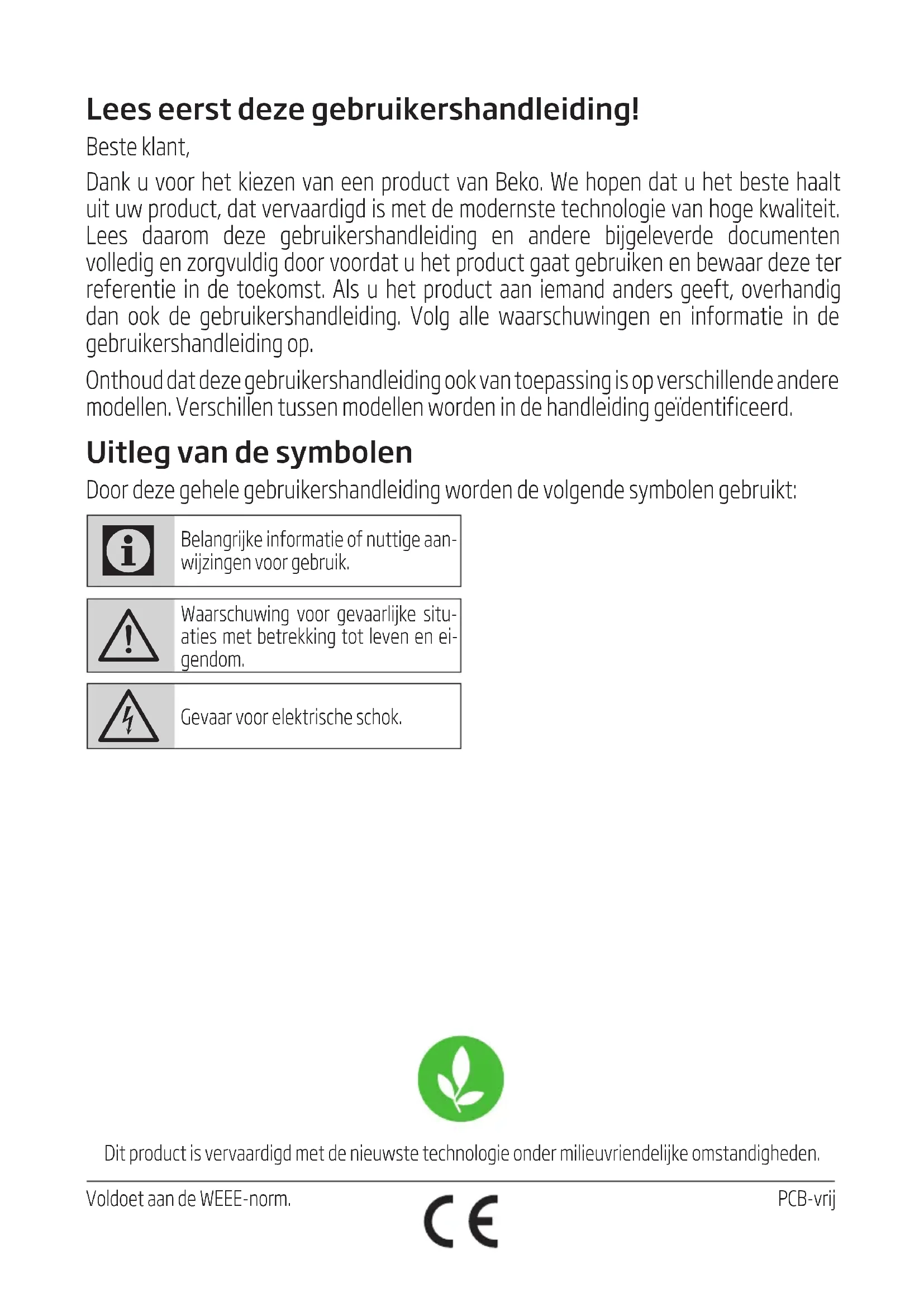 Czyszczene konserwacjaLees eerst deze gebruikershandleiding! Beste klant, Dank u voor het kiezen van een product van Beko. We hopen dat u het beste haalt uit uw product, dat vervaardigd is met de modernste technologie van hoge kwaliteit. Lees daarom deze gebruikershandleiding en andere bijgeleverde documenten volledig en zorgvuldig door voordat u het product gaat gebruiken en bewaar deze ter referentie in de toekomst. Als u het product aan iemand anders geeft, overhandig dan ook de gebruikershandleiding. Volg alle waarschuwingen en informatie in de gebruikershandleiding op. Onthoud dat deze gebruikershandleiding ook van toepassing is op verschillende andere modellen. Verschillen tussen modellen worden in de handleiding geïdentificeerd. Uitleg van de symbolen Door deze gehele gebruikershandleiding worden de volgende symbolen gebruikt: