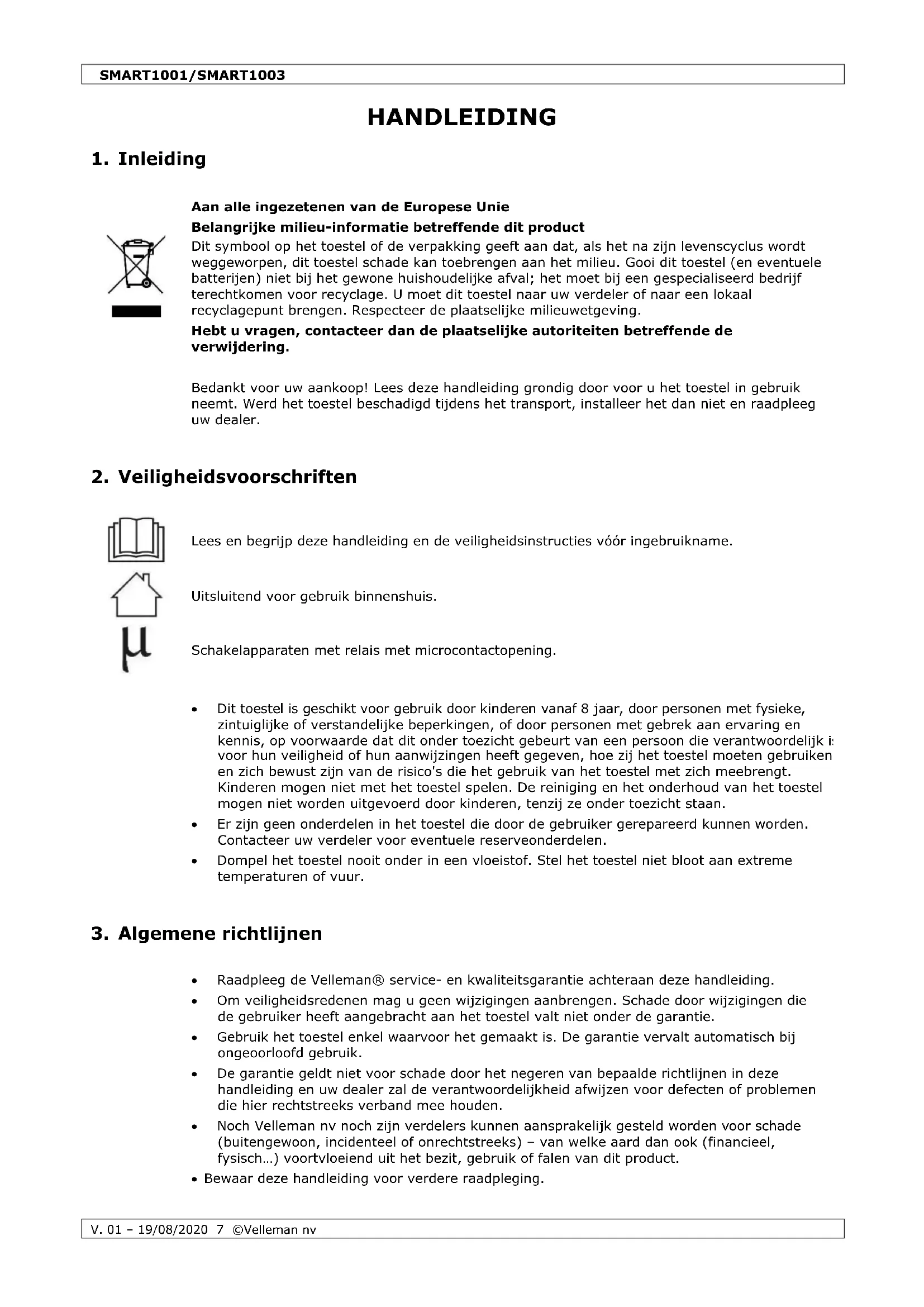 © AUTEURSRECHT Velleman nv heeft het auteursrecht voor deze handleiding. Alle wereldwijde rechten voorbehouden. Het is niet toegestaan om deze handleiding of gedeelten ervan over te nemen, te kopiëren, te vertalen, te bewerken en op te slaan op een elektronisch medium zonder voorafgaande schriftelijke toestemming van de rechthebbende.SMART1001/SMART1003