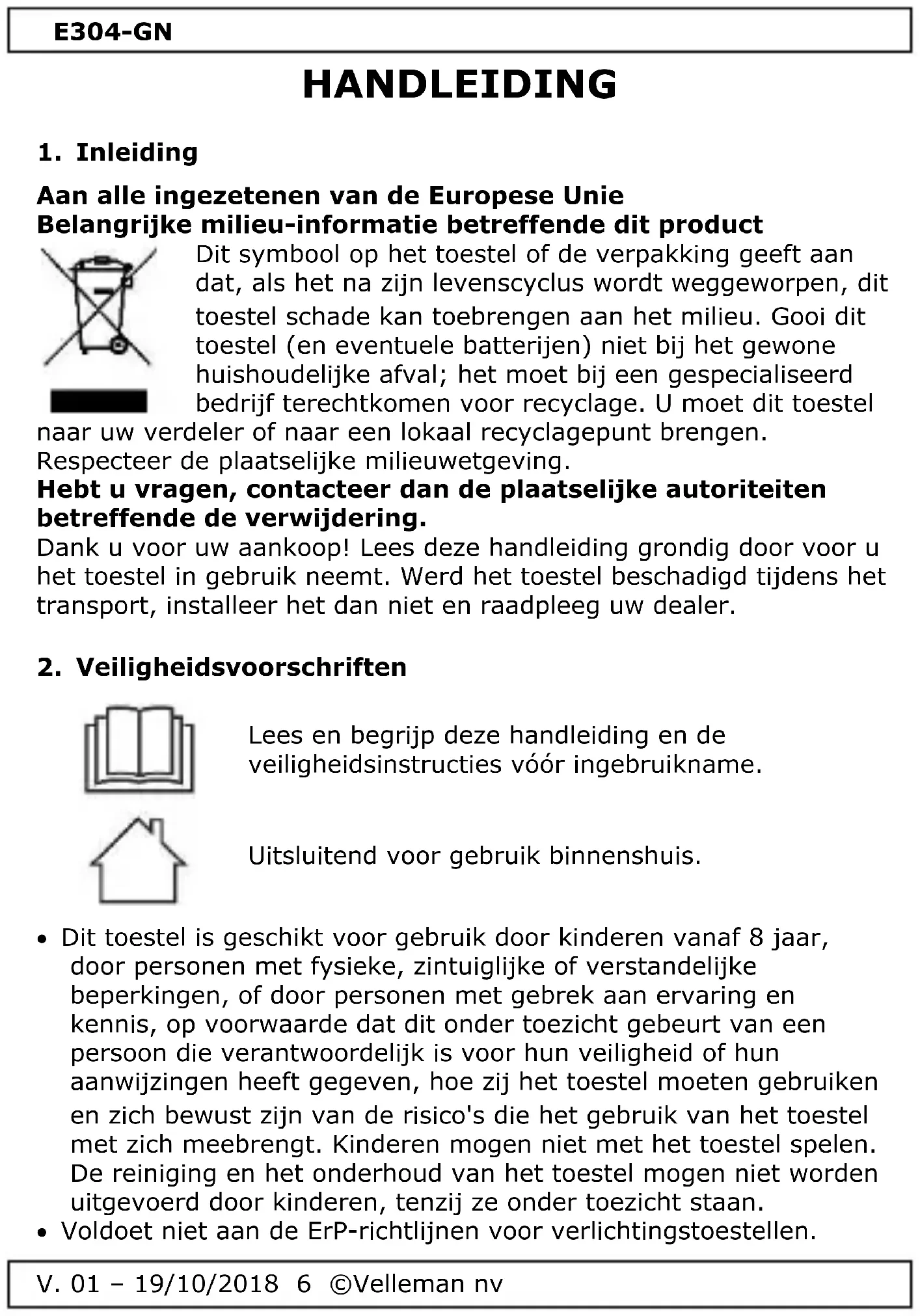 Dit toestel is geschikt voor gebruik door kinderen vanaf 8 jaar, door personen met fysieke, zintuiglijke of verstandelijke beperkingen, of door personen met gebrek aan ervaring en kennis, op voorwaarde dat dit onder toezicht gebeurt van een persoon die verantwoordelijk is voor hun veiligheid of hun aanwijzingen heeft gegeven, hoe zij het toestel moeten gebruiken en zich bewust zijn van de risico's die het gebruik van het toestel met zich meebrengt. Kinderen mogen niet met het toestel spelen. De reiniging en het onderhoud van het toestel mogen niet worden uitgevoerd door kinderen, tenzij ze onder toezicht staan. Voldoet niet aan de ErP-richtlijnen voor verlichtingstoestellen.E304-GN