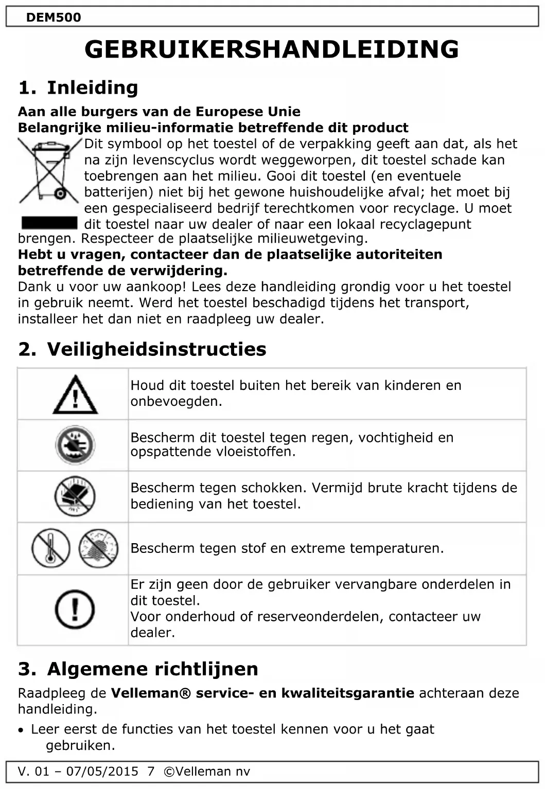 Raadpleeg de Velleman® service- en kwaliteitsgarantie achteraan deze handleiding. Leer eerst de functies van het toestel kennen voor u het gaat gebruiken.DEM500