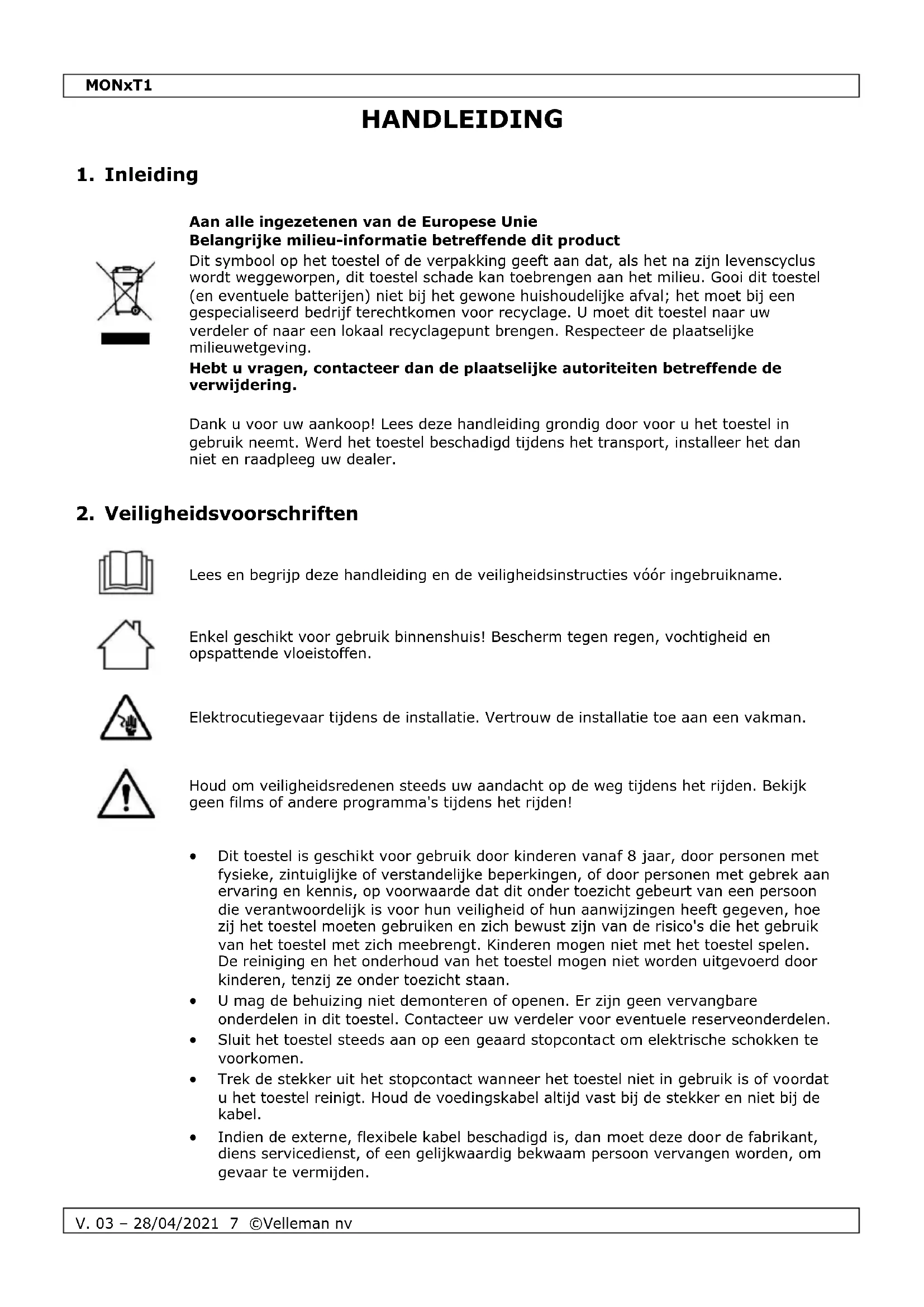 Velleman nv heeft het auteursrecht voor deze handleiding. Alle wereldwijde rechten voorbehouden. Het is niet toegestaan om deze handleiding of gedeelten ervan over te nemen, te kopiëren, te vertalen, te bewerken en op te slaan op een elektronisch medium zonder voorafgaande schriftelijke toestemming van de rechthebbende.MONxT1