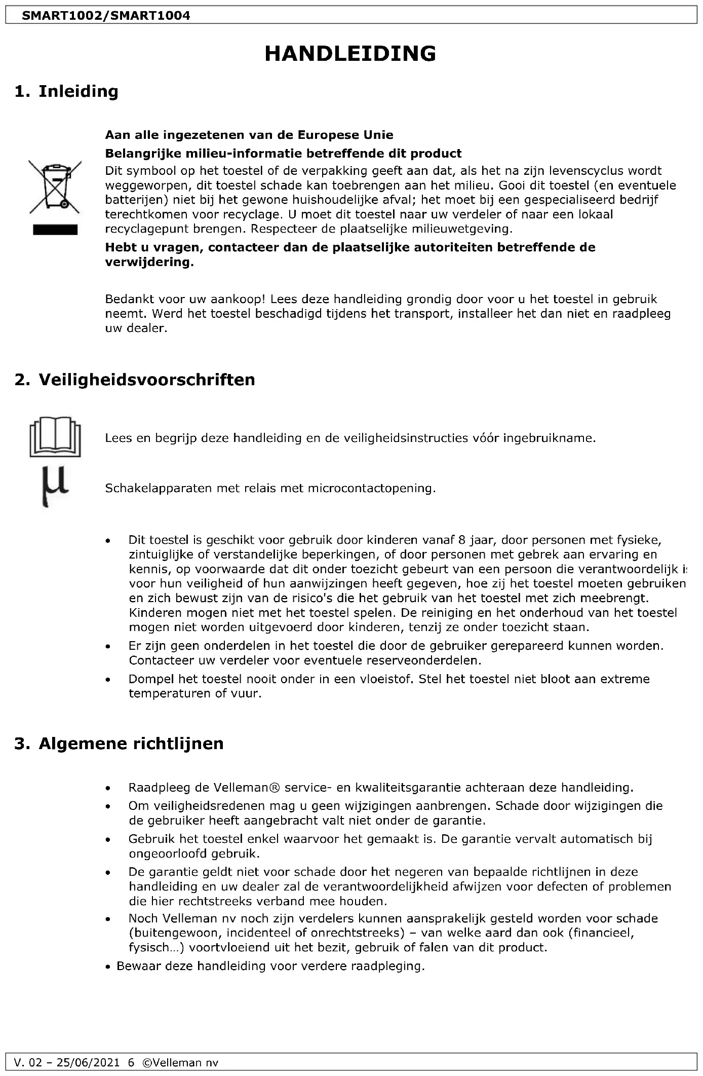 © AUTEURSRECHT Velleman nv heeft het auteursrecht voor deze handleiding. Alle wereldwijde rechten voorbehouden. Het is niet toegestaan om deze handleiding of gedeelten ervan over te nemen, te kopiëren, te vertalen, te bewerken en op te slaan op een elektronisch medium zonder voorafgaande schriftelijke toestemming van de rechthebbende.SMART1002/SMART1004