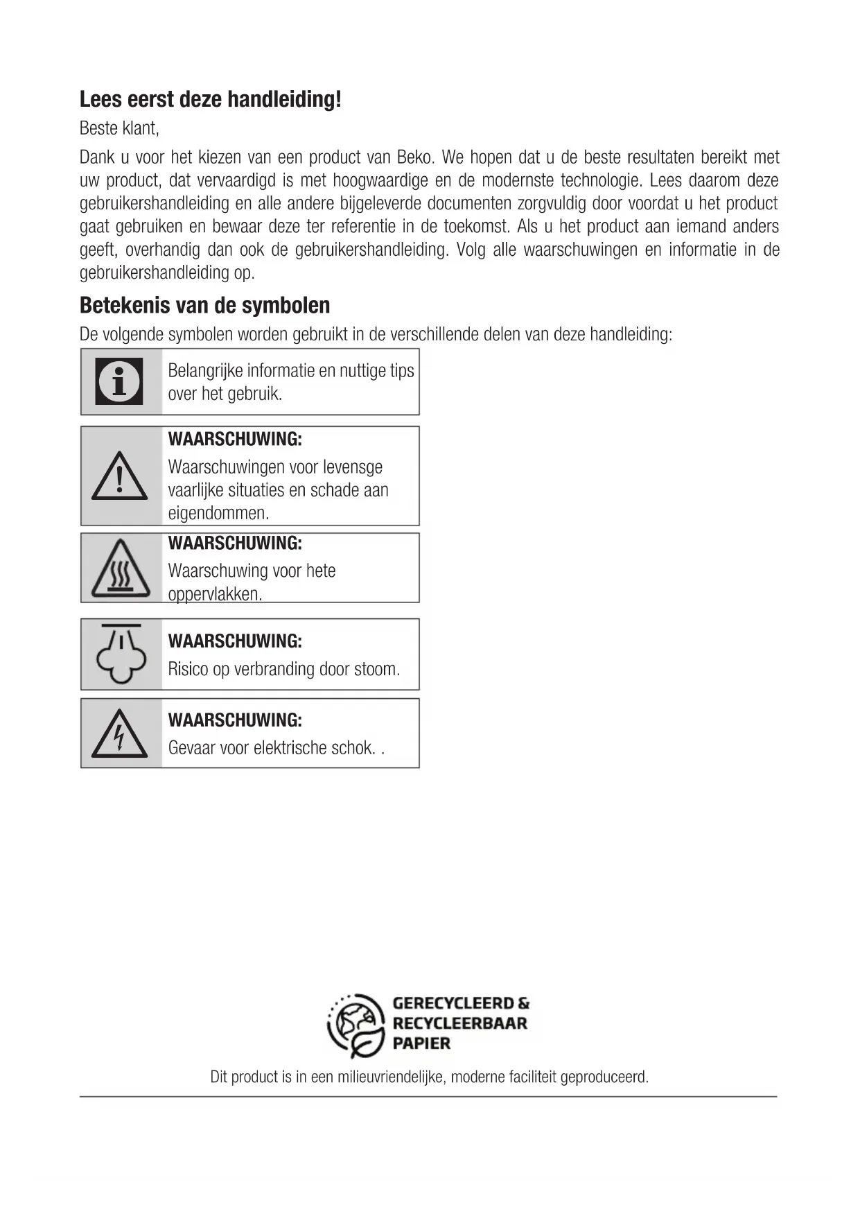 Lees eerst deze handleiding! Beste klant, Dank u voor het kiezen van een product van Beko. We hopen dat u de beste resultaten bereikt met uw product, dat vervaardigd is met hoogwaardige en de modernste technologie. Lees daarom deze gebruikershandleiding en alle andere bijgeleverde documenten zorgvuldig door voordat u het product gaat gebruiken en bewaar deze ter referentie in de toekomst. Als u het product aan iemand anders geeft, overhandig dan ook de gebruikershandleiding. Volg alle waarschuwingen en informatie in de gebruikershandleiding op. Betekenis van de symbolen De volgende symbolen worden gebruikt in de verschillende delen van deze handleiding: