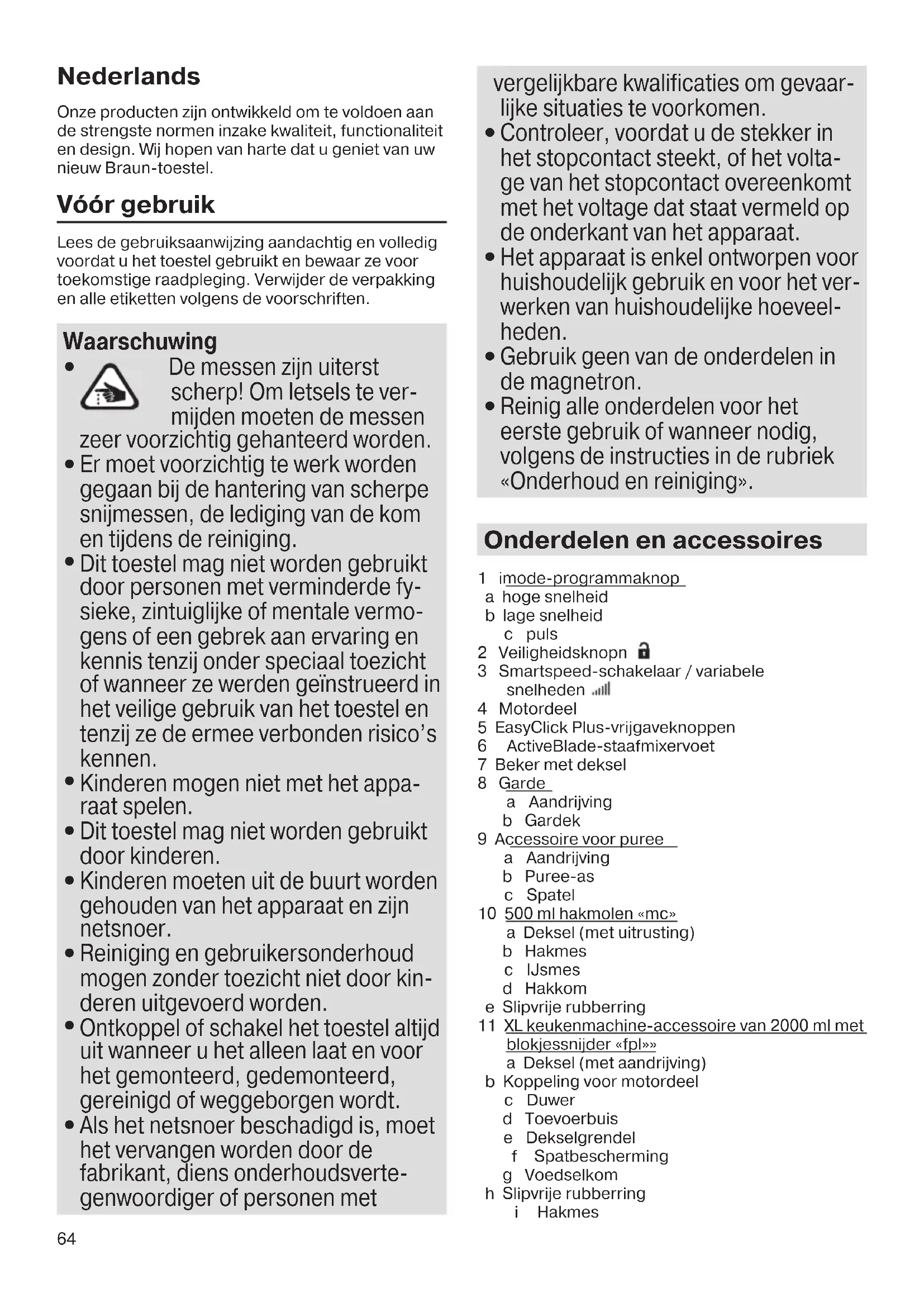 - De messen zijn erg scherp. Neem de onderdelen enkel vast aan de plastic componenten.