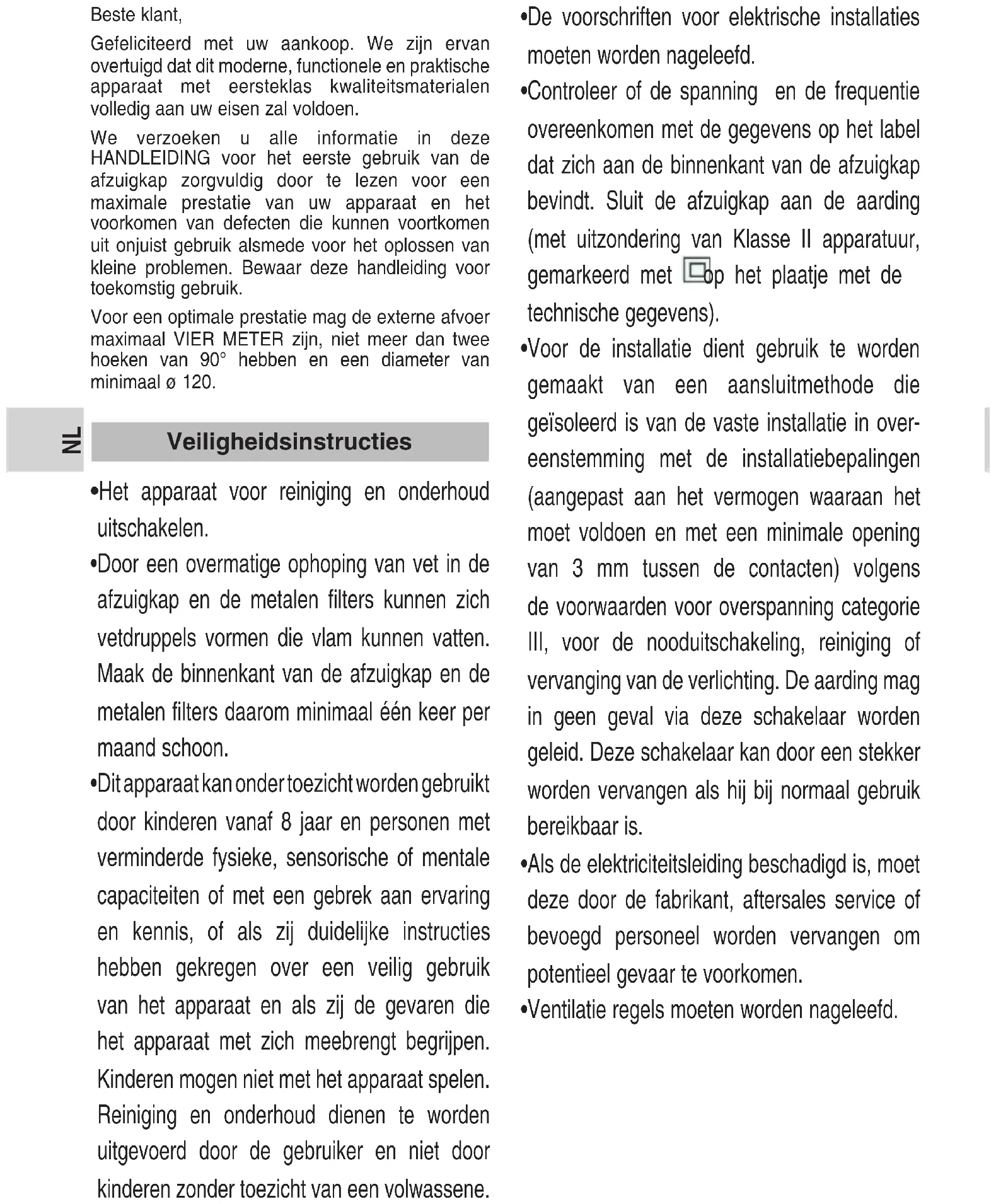 Beste klant, Gefeliciteerd met uw aankoop. We zijn ervan overtuigd dat dit moderne, functionele en praktische apparaat met eersteklas kwaliteitsmaterialen volledig aan uw eisen zal voldoen. We verzoeken u alle informatie in deze HANDLEIDING voor het eerste gebruik van de afzuigkap zorgvuldig door te lezen voor een maximale prestatie van uw apparaat en het voorkomen van defecten die kunnen voortkomen uit onjuist gebruik alsmede voor het oplossen van kleine problemen. Bewaar deze handleiding voor toekomstig gebruik. Voor een optimale prestatie mag de externe afvoer maximaal VIER METER zijn, niet meer dan twee hoeken van 90° hebben en een diameter van minimaal ø 120.