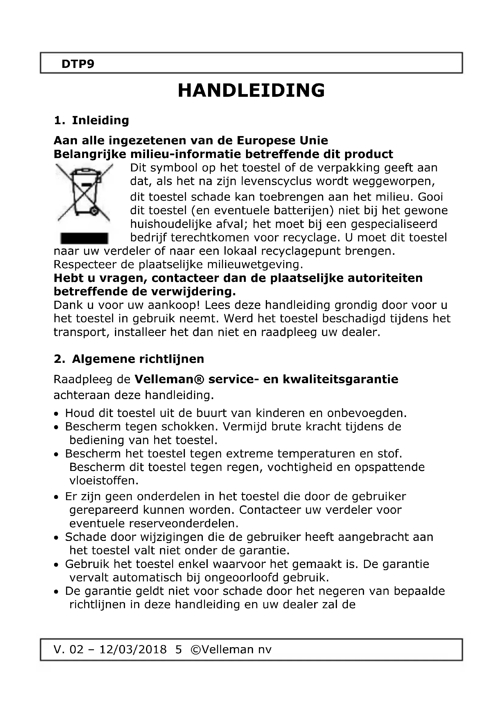 Raadpleeg de Velleman® service- en kwaliteitsgarantie achteraan deze handleiding. Houd dit toestel uit de buurt van kinderen en onbevoegden. Bescherm tegen schokken. Vermijd brute kracht tijdens de bediening van het toestel. Bescherm het toestel tegen extreme temperaturen en stof. Bescherm dit toestel tegen regen, vochtigheid en opspattende vloeistoffen. Er zijn geen onderdelen in het toestel die door de gebruiker gerepareerd kunnen worden. Contacteer uw verdeler voor eventuele reserveonderdelen. Schade door wijzigingen die de gebruiker heeft aangebracht aan het toestel valt niet onder de garantie. Gebruik het toestel enkel waarvoor het gemaakt is. De garantie vervalt automatisch bij ongeoorloofd gebruik. De garantie geldt niet voor schade door het negeren van bepaalde richtlijnen in deze handleiding en uw dealer zal deDTP9