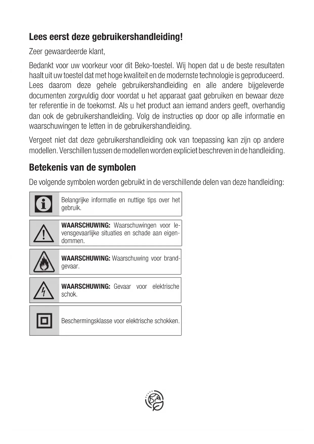 Garantiebedingungen Beko Grundig Deutschland GmbH Rahmannstraße 3 65760 EschbornLees eerst deze gebruikershandleiding! Zeer gewaardeerde klant, Bedankt voor uw voorkeur voor dit Beko-toestel. Wij hopen dat u de beste resultaten haalt uit uw toestel dat met hoge kwaliteit en de modernste technologie is geproduceerd. Lees daarom deze gehele gebruikershandleiding en alle andere bijgeleverde documenten zorgvuldig door voordat u het apparaat gaat gebruiken en bewaar deze ter referentie in de toekomst. Als u het product aan iemand anders geeft, overhandig dan ook de gebruikershandleiding. Volg de instructies op door op alle informatie en waarschuwingen te letten in de gebruikershandleiding. Vergeet niet dat deze gebruikershandleiding ook van toepassing kan zijn op andere modellen. Verschillen tussen de modellen worden expliciet beschreven in de handleiding. Betekenis van de symbolen De volgende symbolen worden gebruikt in de verschillende delen van deze handleiding: