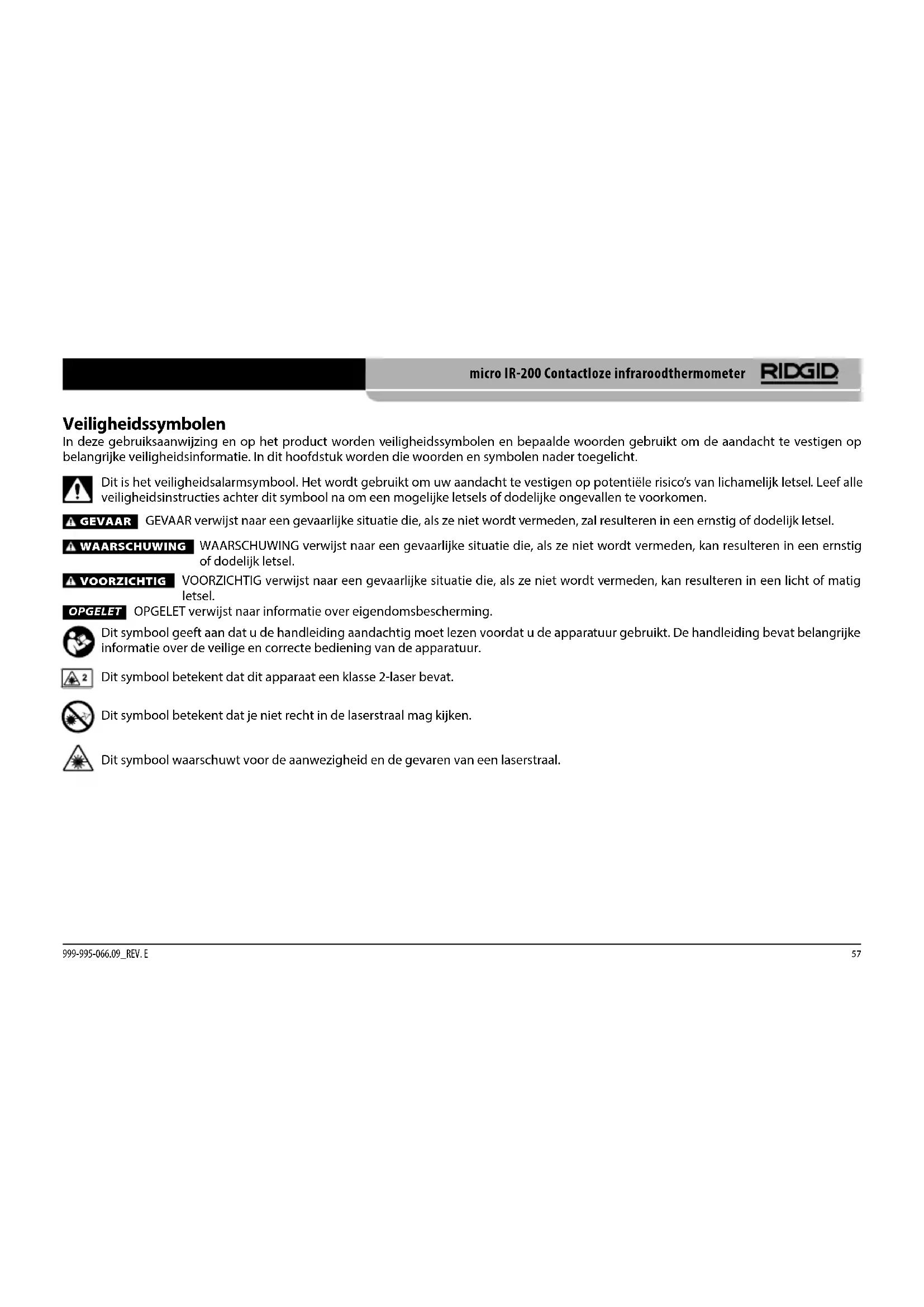 - Laat uw apparatuur onderhouden en repareren door een bevoeg- de hersteldienst die uitsluitend originele reserveonderdelen ge- bruikt. Zo wordt de veiligheid van het gereedschap gewaarborgd. Specifieke veiligheidsinformatie WAARSCHUWING Dit hoofdstuk bevat belangrijke veiligheidsinformatie die speci- fiek betrekking heeft op dit toestel. Lees deze veiligheidsvoorschriften zorgvuldig alvorens de RIDGID® micro IR-200 contactloze infraroodthermometer te gebruiken om het risico van oogletsels of andere ernstige lichamelijke letsels te verkleinen. BEWAAR DEZE INSTRUCTIES! Bewaar deze handleiding voor de gebruiker bij de machine. Infraroodthermometerveiligheid