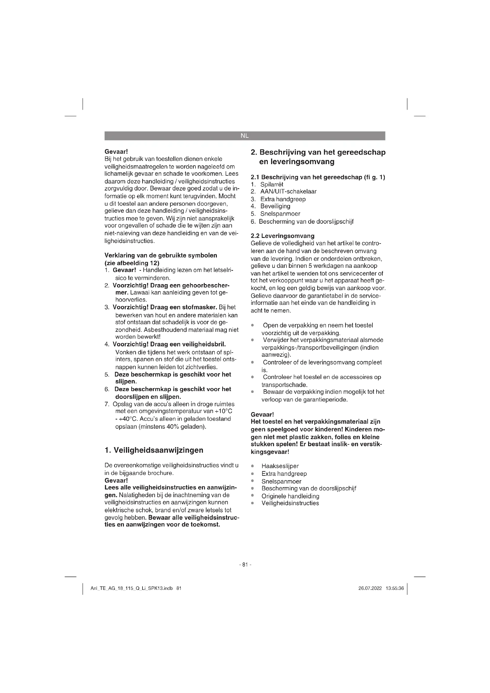 uit hand-arm-trillingen indien het toestel lang zonder onderbreking wordt gebruikt of niet naar behoren wordt gehanteerd en onder- houden. Anl_TE_AG_18_115_Q_Li_SPK13.indb 82Anl_TE_AG_18_115_Q_Li_SPK13.indb 82 26.07.2022 13:55:3626.07.2022 13:55:36NL