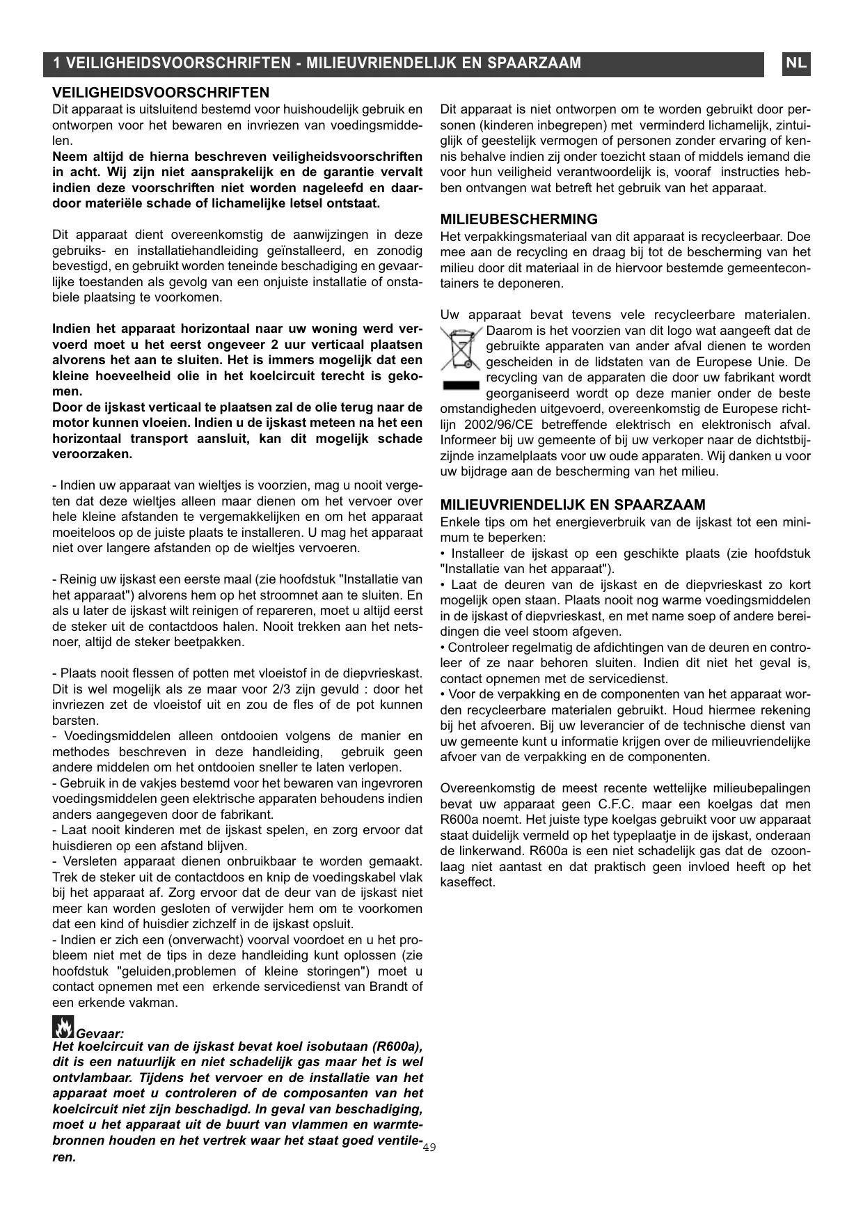 VEILIGHEIDSVOORSCHRIFTEN Dit apparaat is uitsluitend bestemd voor huishoudelijk gebruik en ontworpen voor het bewaren en invriezen van voedingsmiddelen. Neem altijd de hierna beschreven veiligheidsvoorschriften in acht. Wij zijn niet aansprakelijk en de garantie vervalt indien deze voorschriften niet worden nageleefd en daardoor materiële schade of lichamelijke letsel ontstaat. Dit apparaat is niet ontworpen om te worden gebruikt door personen (kinderen inbegrepen) met verminderd lichamelijk, zintuiglijk of geestelijk vermogen of personen zonder ervaring of kennis behalve indien zij onder toezicht staan of middels iemand die voor hun veiligheid verantwoordelijk is, vooraf instructies hebben ontvangen wat betreft het gebruik van het apparaat. MILIEUBESCHERMING Dit apparaat dient overeenkomstig de aanwijzingen in deze gebruiks- en installatiehandleiding geïnstalleerd, en zonodig bevestigd, en gebruikt worden teneinde beschadiging en gevaarlijke toestanden als gevolg van een onjuiste installatie of onstabiele plaatsing te voorkomen. Het verpakkingsmateriaal van dit apparaat is recycleerbaar. Doe mee aan de recycling en draag bij tot de bescherming van het milieu door dit materiaal in de hiervoor bestemde gemeentecontainers te deponeren. Indien het apparaat horizontaal naar uw woning werd vervoerd moet u het eerst ongeveer 2 uur verticaal plaatsen alvorens het aan te sluiten. Het is immers mogelijk dat een kleine hoeveelheid olie in het koelcircuit terecht is gekomen. Door de ijskast verticaal te plaatsen zal de olie terug naar de motor kunnen vloeien. Indien u de ijskast meteen na het een horizontaal transport aansluit, kan dit mogelijk schade veroorzaken. Uw apparaat bevat tevens vele recycleerbare materialen. Daarom is het voorzien van dit logo wat aangeeft dat de gebruikte apparaten van ander afval dienen te worden gescheiden in de lidstaten van de Europese Unie. De recycling van de apparaten die door uw fabrikant wordt georganiseerd wordt op deze manier onder de beste omstandigheden uitgevoerd, overeenkomstig de Europese richtlijn 2002/96/CE betreffende elektrisch en elektronisch afval. Informeer bij uw gemeente of bij uw verkoper naar de dichtstbijzijnde inzamelplaats voor uw oude apparaten. Wij danken u voor uw bijdrage aan de bescherming van het milieu. - Indien uw apparaat van wieltjes is voorzien, mag u nooit vergeten dat deze wieltjes alleen maar dienen om het vervoer over hele kleine afstanden te vergemakkelijken en om het apparaat moeiteloos op de juiste plaats te installeren. U mag het apparaat niet over langere afstanden op de wieltjes vervoeren. - Reinig uw ijskast een eerste maal (zie hoofdstuk "Installatie van het apparaat") alvorens hem op het stroomnet aan te sluiten. En als u later de ijskast wilt reinigen of repareren, moet u altijd eerst de steker uit de contactdoos halen. Nooit trekken aan het netsnoer, altijd de steker beetpakken. - Plaats nooit flessen of potten met vloeistof in de diepvrieskast. Dit is wel mogelijk als ze maar voor 2/3 zijn gevuld : door het invriezen zet de vloeistof uit en zou de fles of de pot kunnen barsten. - Voedingsmiddelen alleen ontdooien volgens de manier en methodes beschreven in deze handleiding, gebruik geen andere middelen om het ontdooien sneller te laten verlopen. - Gebruik in de vakjes bestemd voor het bewaren van ingevroren voedingsmiddelen geen elektrische apparaten behoudens indien anders aangegeven door de fabrikant. - Laat nooit kinderen met de ijskast spelen, en zorg ervoor dat huisdieren op een afstand blijven. - Versleten apparaat dienen onbruikbaar te worden gemaakt. Trek de steker uit de contactdoos en knip de voedingskabel vlak bij het apparaat af. Zorg ervoor dat de deur van de ijskast niet meer kan worden gesloten of verwijder hem om te voorkomen dat een kind of huisdier zichzelf in de ijskast opsluit. - Indien er zich een (onverwacht) voorval voordoet en u het probleem niet met de tips in deze handleiding kunt oplossen (zie hoofdstuk "geluiden,problemen of kleine storingen") moet u contact opnemen met een erkende servicedienst van Brandt of een erkende vakman. Gevaar: Het koelcircuit van de ijskast bevat koel isobutaan (R600a), dit is een natuurlijk en niet schadelijk gas maar het is wel ontvlambaar. Tijdens het vervoer en de installatie van het apparaat moet u controleren of de composanten van het koelcircuit niet zijn beschadigd. In geval van beschadiging, moet u het apparaat uit de buurt van vlammen en warmtebronnen houden en het vertrek waar het staat goed ventile-49 ren.