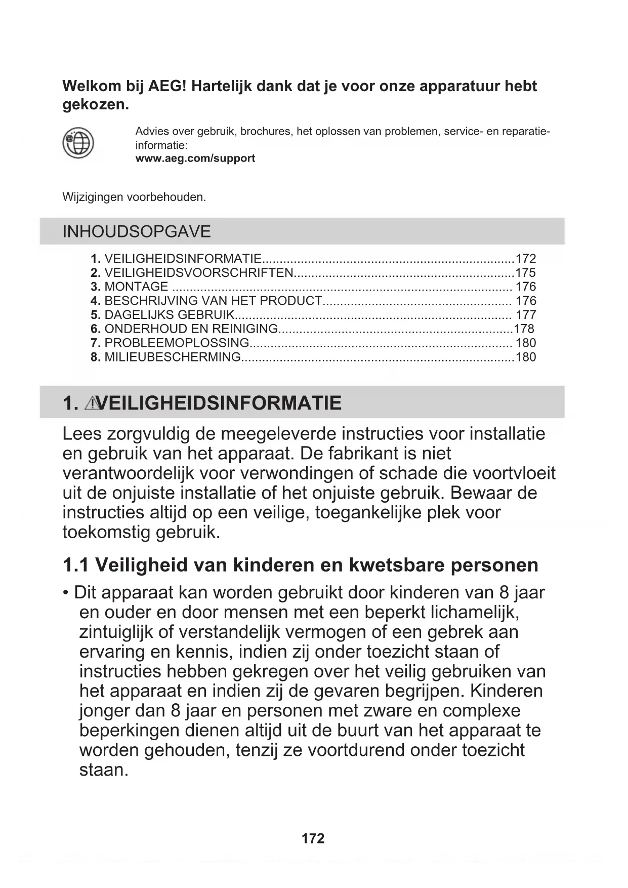 Recycleer de materialen met het symbool . Gooi de verpakking in een geschikte afvalcontainer om het te recycleren. Bescherm het milieu en de volksgezondheid en recycleer op een correcte manier het afval van elektrische en elektronische apparaten. Gooi apparaten gemarkeerd met het symbool niet weg met het huishoudelijk afval. Breng het product naar het milieustation bij u in de buurt of neem contact op met de gemeente. 180Velkommen til AEG! Takk for at du valgte produktet vårt. Få råd om bruk, brosjyrer, hjelp til feilsøking, og informasjon om service ogreparasjon:www.aeg.com/supportMed forbehold om endringer. INNHOLD