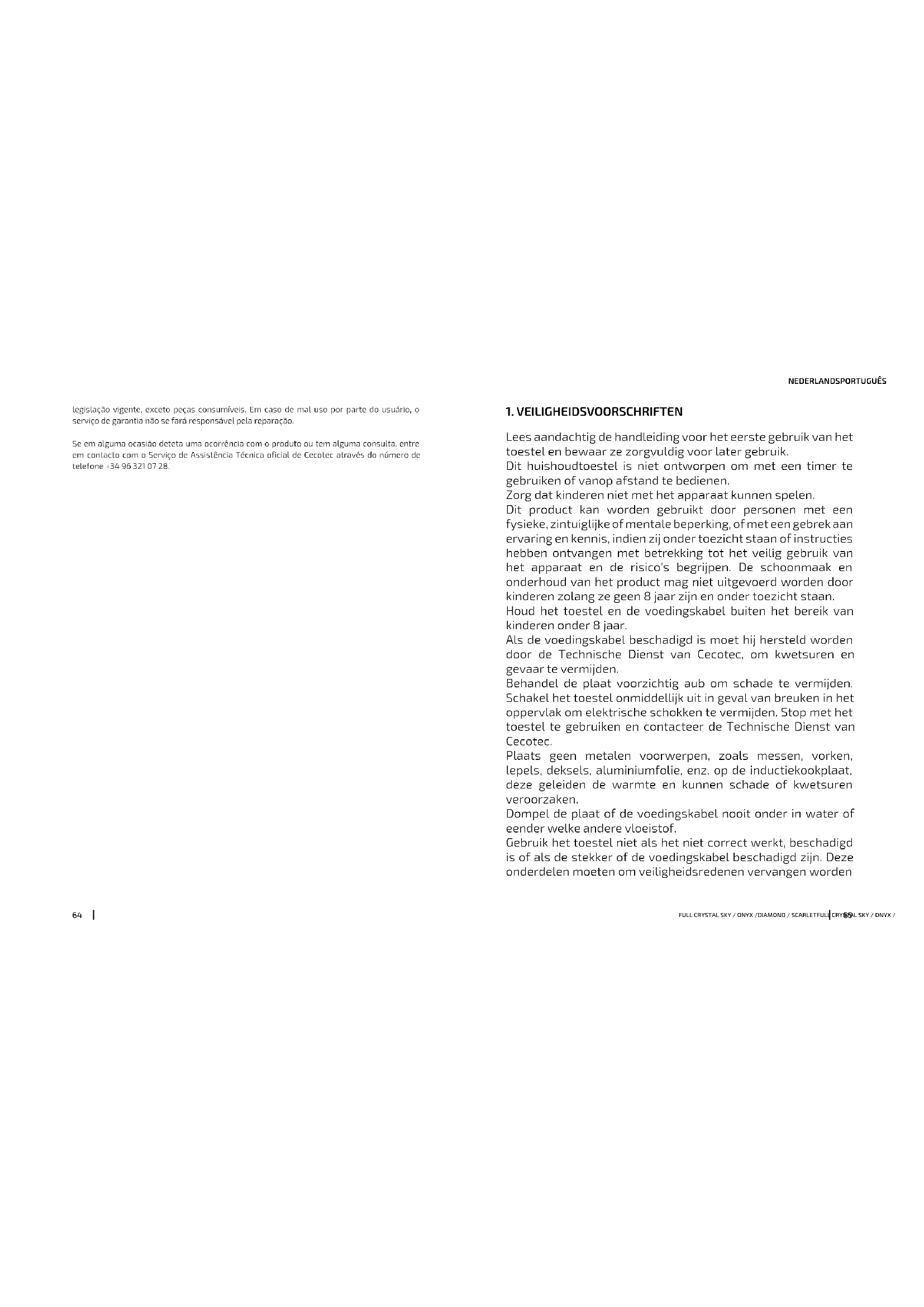 Lees aandachtig de handleiding voor het eerste gebruik van het toestel en bewaar ze zorgvuldig voor later gebruik. Dit huishoudtoestel is niet ontworpen om met een timer te gebruiken of vanop afstand te bedienen. Zorg dat kinderen niet met het apparaat kunnen spelen. Dit product kan worden gebruikt door personen met een fysieke, zintuiglijke of mentale beperking, of met een gebrek aan ervaring en kennis, indien zij onder toezicht staan of instructies hebben ontvangen met betrekking tot het veilig gebruik van het apparaat en de risico's begrijpen. De schoonmaak en onderhoud van het product mag niet uitgevoerd worden door kinderen zolang ze geen 8 jaar zijn en onder toezicht staan. Houd het toestel en de voedingskabel buiten het bereik van kinderen onder 8 jaar. Als de voedingskabel beschadigd is moet hij hersteld worden door de Technische Dienst van Cecotec, om kwetsuren en gevaar te vermijden. Behandel de plaat voorzichtig aub om schade te vermijden. Schakel het toestel onmiddellijk uit in geval van breuken in het oppervlak om elektrische schokken te vermijden. Stop met het toestel te gebruiken en contacteer de Technische Dienst van Cecotec. Plaats geen metalen voorwerpen, zoals messen, vorken, lepels, deksels, aluminiumfolie, enz. op de inductiekookplaat, deze geleiden de warmte en kunnen schade of kwetsuren veroorzaken. Dompel de plaat of de voedingskabel nooit onder in water of eender welke andere vloeistof. Gebruik het toestel niet als het niet correct werkt, beschadigd is of als de stekker of de voedingskabel beschadigd zijn. Deze onderdelen moeten om veiligheidsredenen vervangen wordenFULL CRYSTAL SKY / ONYX /DIAMOND / SCARLETFULL CRYSTAL SKY / ONYX /DIAMOND / SCARLET