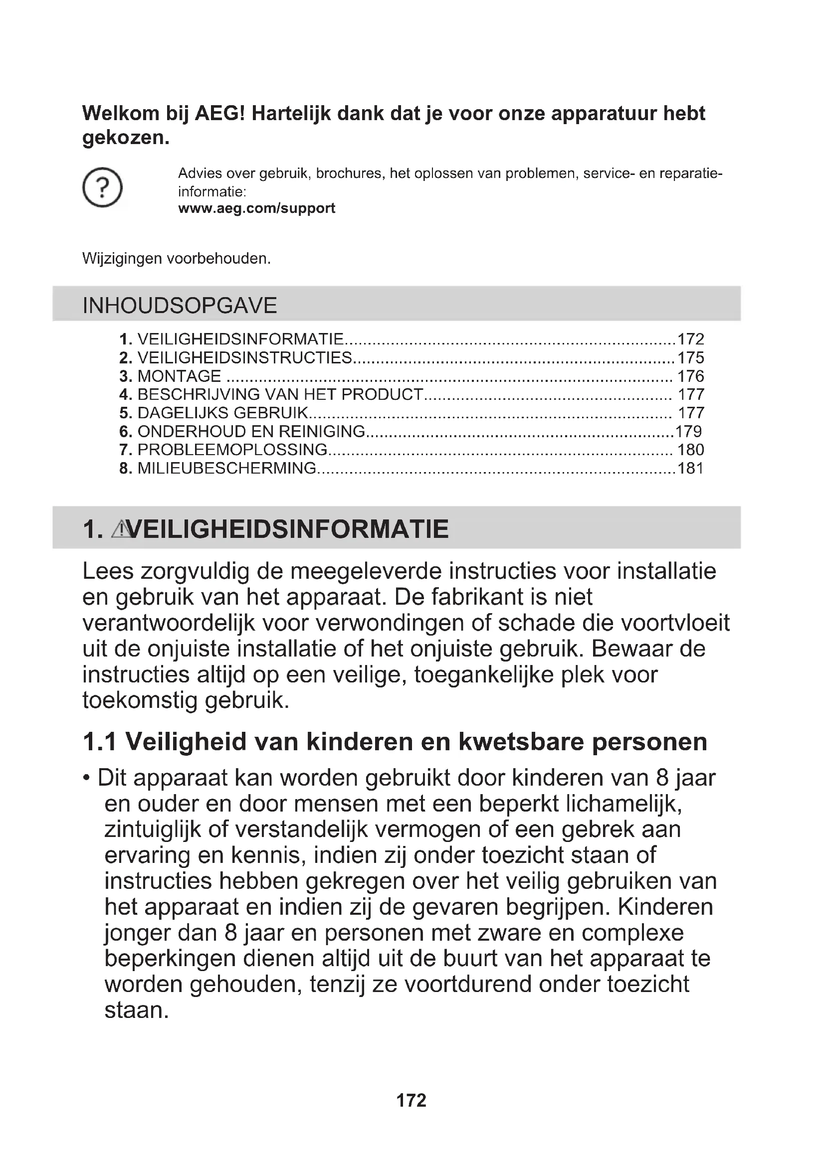 - Dit apparaat kan worden gebruikt door kinderen van 8 jaar en ouder en door mensen met een beperkt lichamelijk, zintuiglijk of verstandelijk vermogen of een gebrek aan ervaring en kennis, indien zij onder toezicht staan of instructies hebben gekregen over het veilig gebruiken van het apparaat en indien zij de gevaren begrijpen. Kinderen jonger dan 8 jaar en personen met zware en complexe beperkingen dienen altijd uit de buurt van het apparaat te worden gehouden, tenzij ze voortdurend onder toezicht staan. 172• Houd toezicht op kinderen om te voorkomen dat zij met het apparaat gaan spelen.