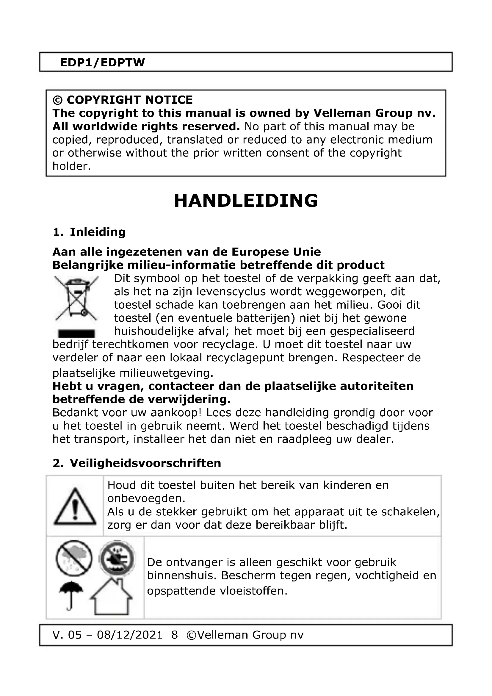 draadloos ................................................................ ja werkbereik ............................ 150 m (zonder obstakels) zelflerend................................................................ ja drukknop ........................................... met led-indicator melodieën .............................................................. 32 IP-norm (zender) ................................................. IP44 voeding zender ............................... 1 x CR2032 (meegelev.) Gebruik dit toestel enkel met originele accessoires. Velleman Group nv is niet aansprakelijk voor schade of kwetsuren bij (verkeerd) gebruik van dit toestel. Voor meer informatie over dit product en de laatste versie van deze handleiding, zie www.perel.eu. De informatie in deze handleiding kan te allen tijde worden gewijzigd zonder voorafgaande kennisgeving. RED Verklaring van overeenstemming Hierbij verklaar ik, Velleman Group nv, dat het type radioapparatuur [EDP1] + [EDPTW] conform is met Richtlijn 2014/53/EU. De volledige tekst van de EU-conformiteitsverklaring kan worden geraadpleegd op het volgende internetadres: www.velleman.eu.EDP1/EDPTW