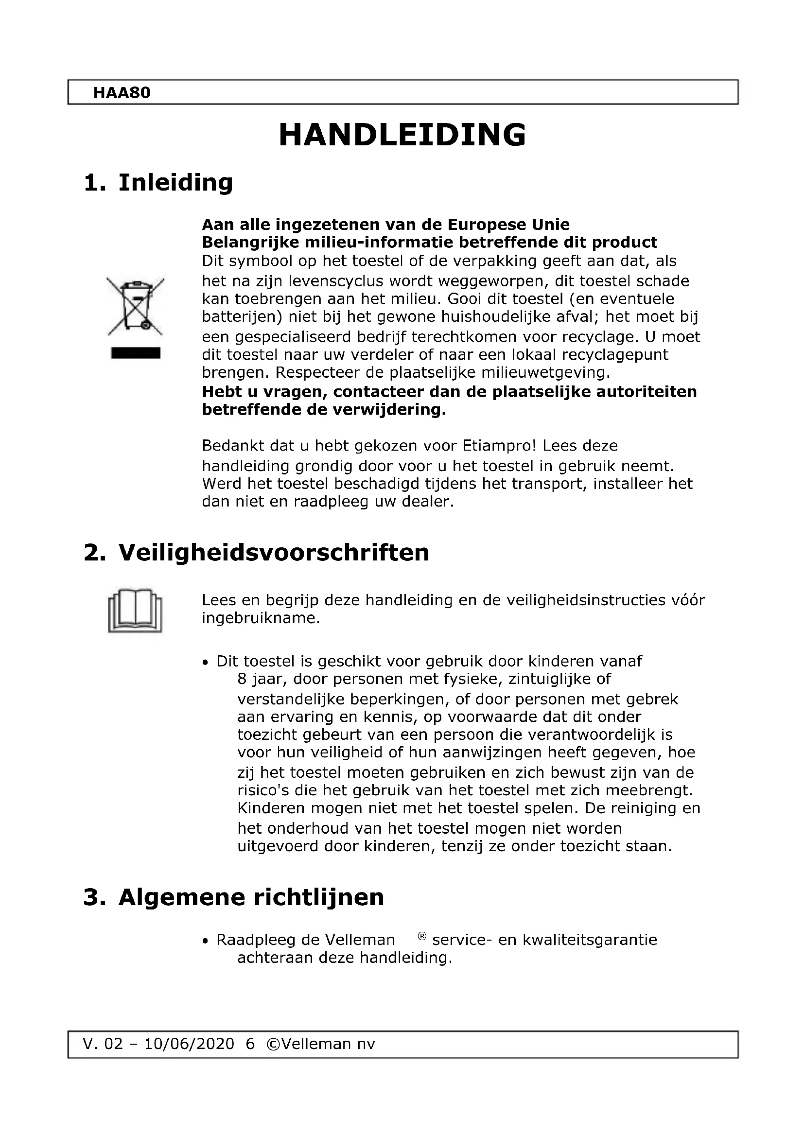Velleman nv heeft het auteursrecht voor deze handleiding. Alle wereldwijde rechten voorbehouden. Het is niet toegestaan om deze handleiding of gedeelten ervan over te nemen, te kopiëren, te vertalen, te bewerken en op te slaan op een elektronisch medium zonder voorafgaande schriftelijke toestemming van de rechthebbende.HAA80
