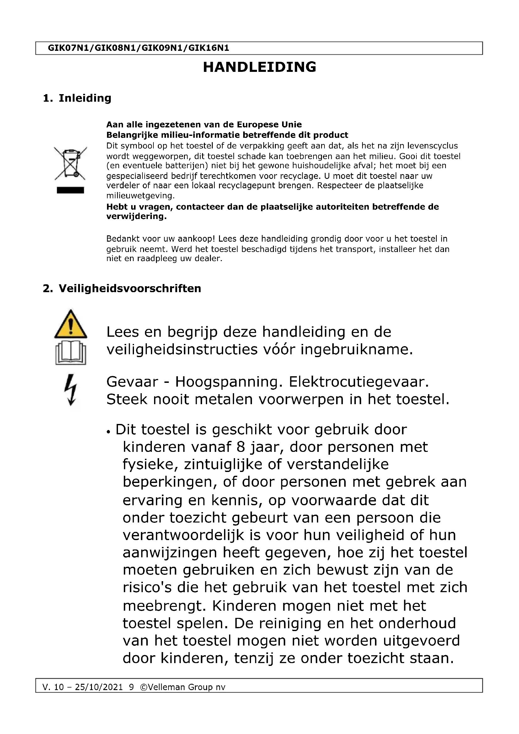 Velleman Group nv heeft het auteursrecht voor deze handleiding. Alle wereldwijde rechten voorbehouden. Het is niet toegestaan om deze handleiding of gedeelten ervan over te nemen, te kopiëren, te vertalen, te bewerken en op te slaan op een elektronisch medium zonder voorafgaande schriftelijke toestemming van de rechthebbende.GIK07N1/GIK08N1/GIK09N1/GIK16N1